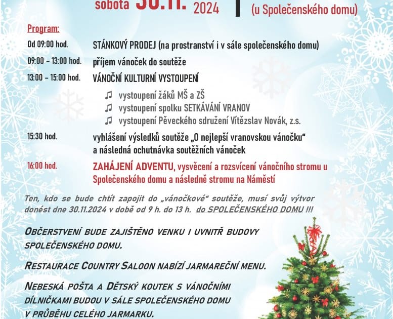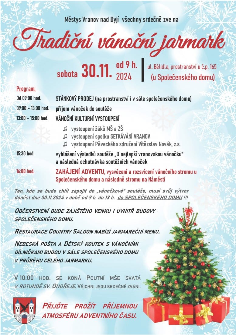 Starobylé městečko Vranov nad Dyjí pod známým barokním zámkem přivítá adventní období tradičním vánočním jarmarkem. Už od 9 hod. nabídnou před Společenským domem místní výrobci a producenti své výrobky, vánoční dekorace, regionální produkty a domácí dobroty. Někteří budou i uvnitř, kde bude po celý den v teple připraven i dětský koutek a Nebeská pošta pro děti. Chybět nebude ani hudební program a vystoupení dětí z místních MŠ a ZŠ.