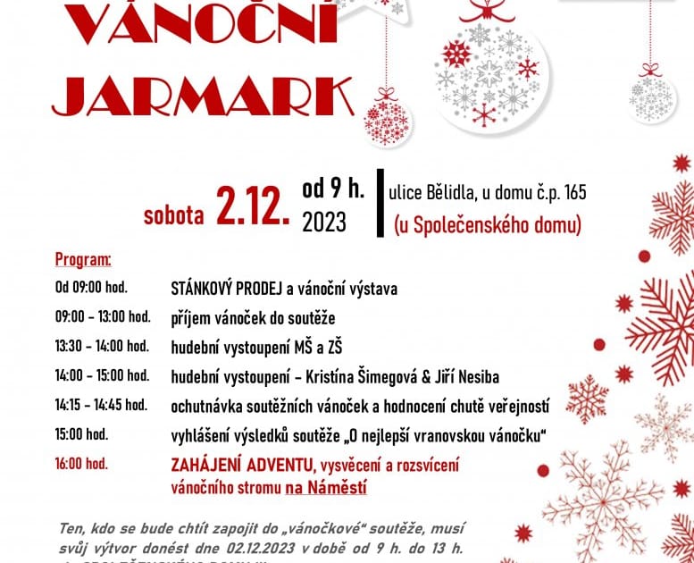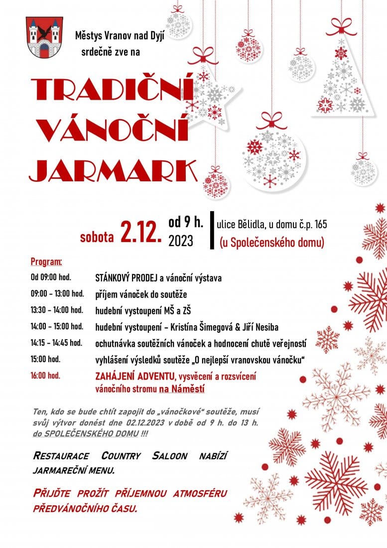 Starobylé městečko Vranov nad Dyjí pod známým barokním zámkem přivítá adventní období tradičním jarmarkem. Už od 9 hod. nabídnou u Společenského domu místní výrobci a producenti své výrobky, vánoční dekorace, regionální produkty a domácí dobroty. Chybět nebude ani hudební program a vystoupení dětí z místních MŠ a ZŠ. Součástí programu je každoročně také soutěž o nejlepší Vranovskou vánočku, o které rozhodne ochutnávka veřejnosti. Večer pak vranovští zahájí advent vysvěcením a rozsvícením velkého vánočního stromu na Náměstí (v 16 hod.).