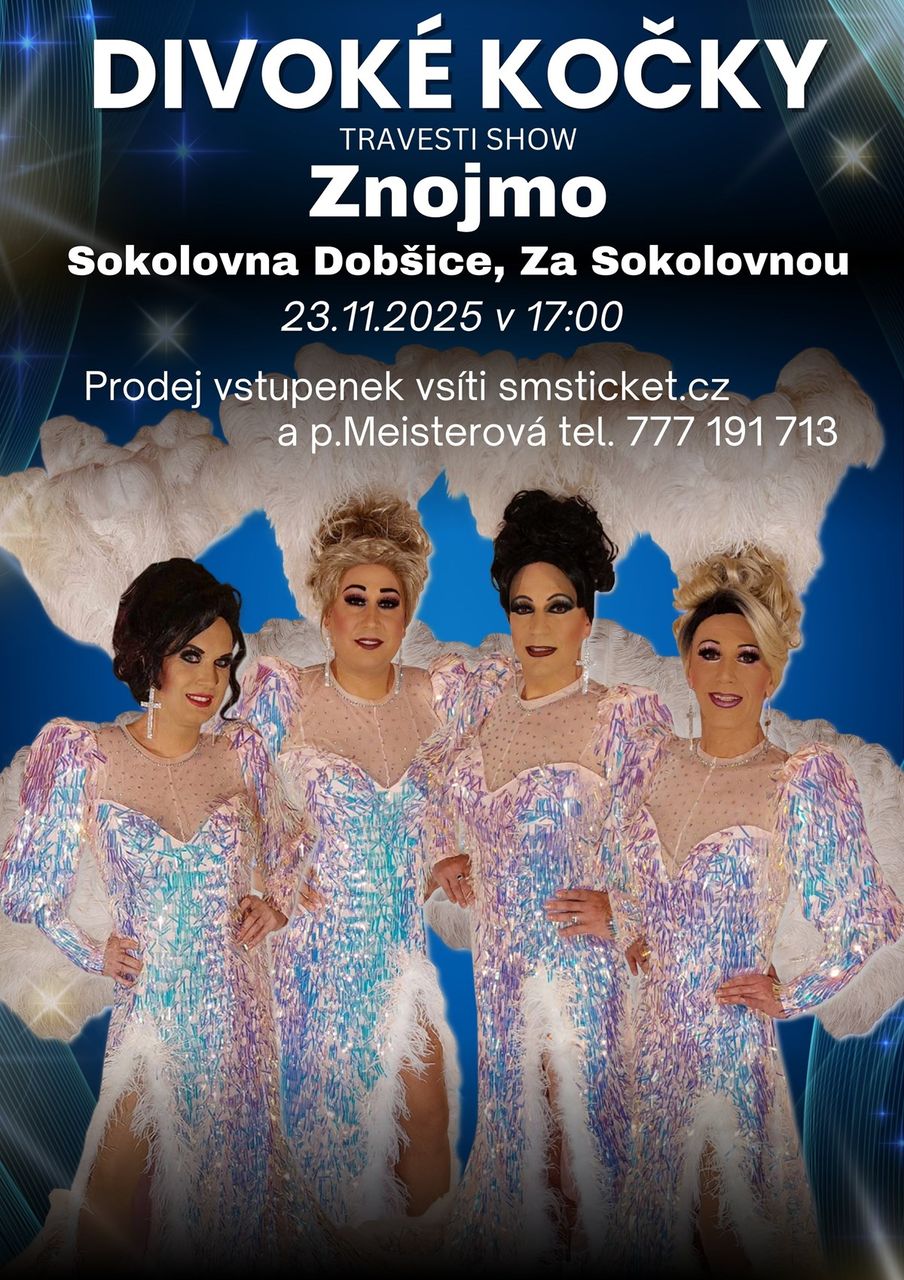 Travesti skupina Divoké kočky z Ostravy přijíždí v rámci svého turné se svým novým programem do Dobšic u Znojma, kde vystoupí 23.11.2025 od 19:00 v sokolovně TJ Sokol Dobšice.
