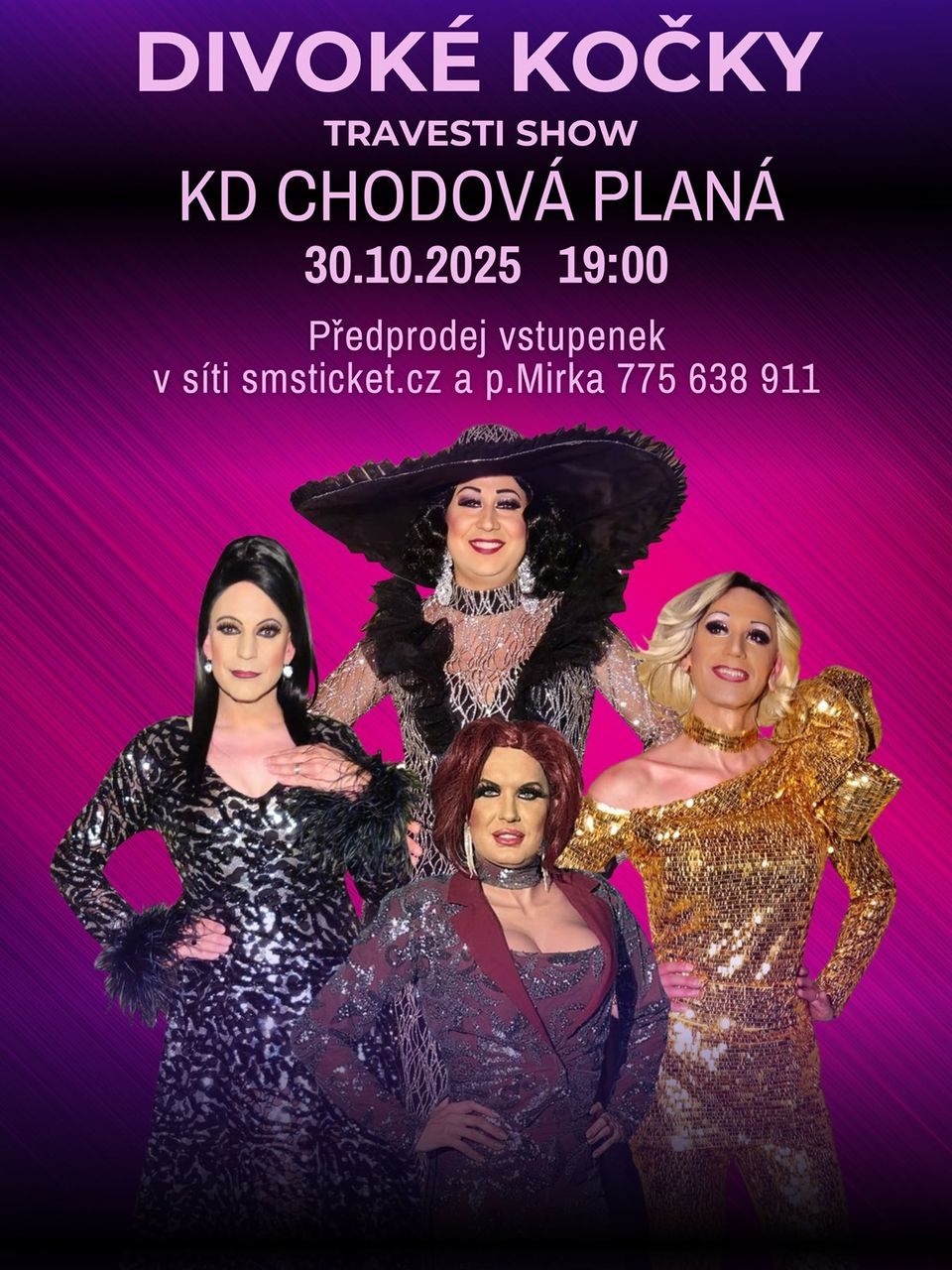 Travesti skupina Divoké kočky z Ostravy přijíždí se svým novým programem do KD Chodová Planá, kde vystoupí 30.10.2025 od 19:00 hod. pro své věrné publikum a diváky ze širokého okolí. Skupina Divoké kočky do západních Čech jezdí od roku 2010 a pravidelně vystupuje v okolí Plzně. Celovečerní zábavný program je plný nezapomenutelných legračních scének, písniček, známých zpěvaček, krásných kostýmů, situačního humoru a hlavně smíchu. Každý divák si přijde na své. Přijdte se sami přesvědčit, že na travesti představení není nic špatného a v podání ostravských umělců se budete určitě dobře bavit. Na závěr programu Vám členové souboru ukážou svou pravou tvář.