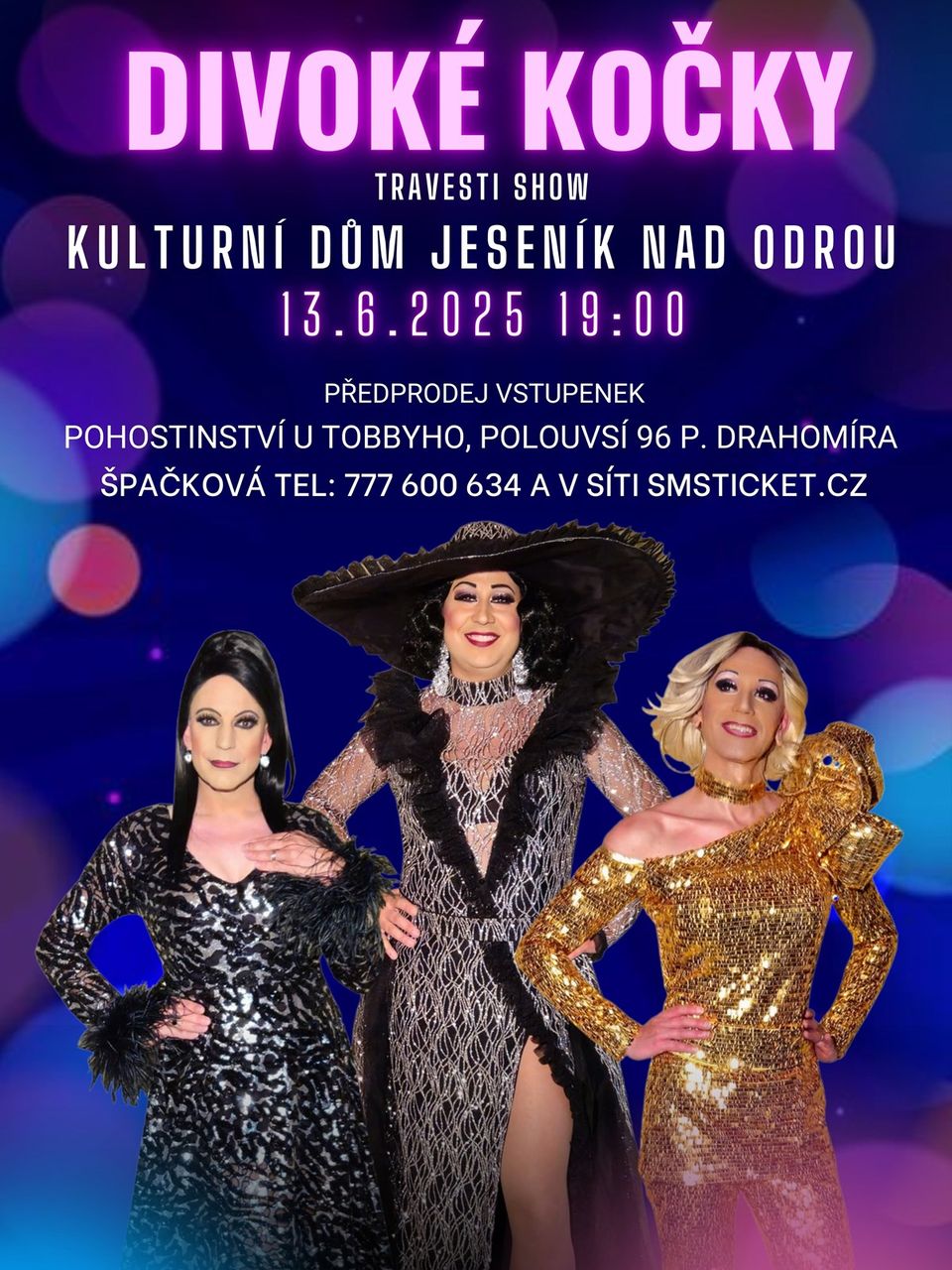 Travesti skupina Divoké kočky z Ostravy přijíždí v rámci svého turné se svým novým programem opět do JESENÍKU NAD ODROU, kde vystoupí v pátek 13.6.2025 od 19:00 na sále kulturního domu.