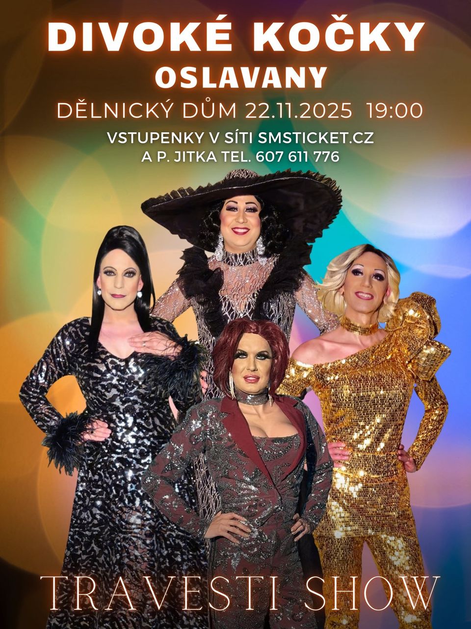 Travesti skupina Divoké kočky z Ostravy přijíždí v rámci svého turné se svým novým programem opět do Oslavan, kde vystoupí 22.11.2025 od 19:00 na sále dělnického domu Oslavany. Celovečerní zábavný program je plný nezapomenutelných legračních scének, písniček, známých zpěvaček, krásných kostýmů, situačního humoru a hlavně smíchu a je vhodný jak pro ženské tak pánské publikum. Jejich vystoupení se těší stálé větší oblibě a tak si každý divák přijde na své. Přijdte se sami přesvědčit, že na travesti představení není nic špatného a v podání ostravských umělců se budete určitě dobře bavit. Divoké kočky jezdí se svým programem do Oslavan pravidelně několik let, a proto se těší opět na úžasné místní publikum, atmosféru a skvělý večer. Na závěr programu Vám členové souboru ukážou svou pravou tvář.
