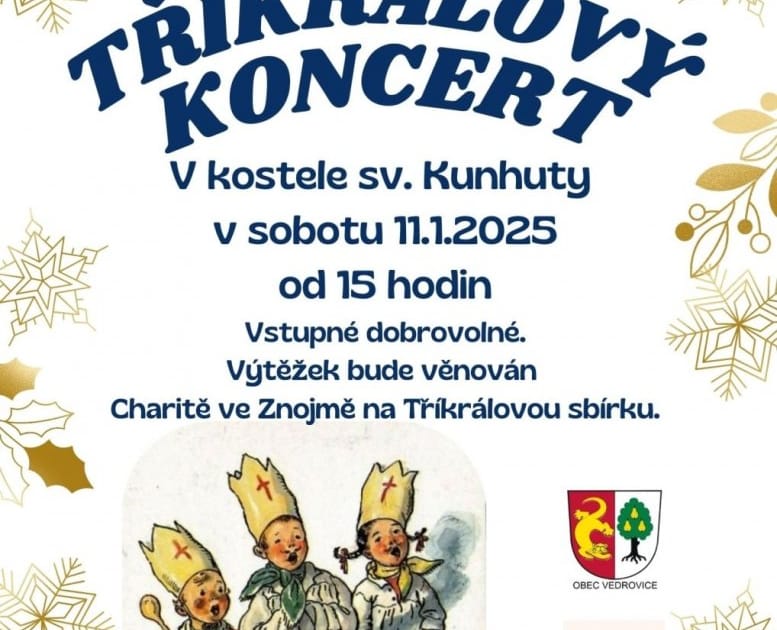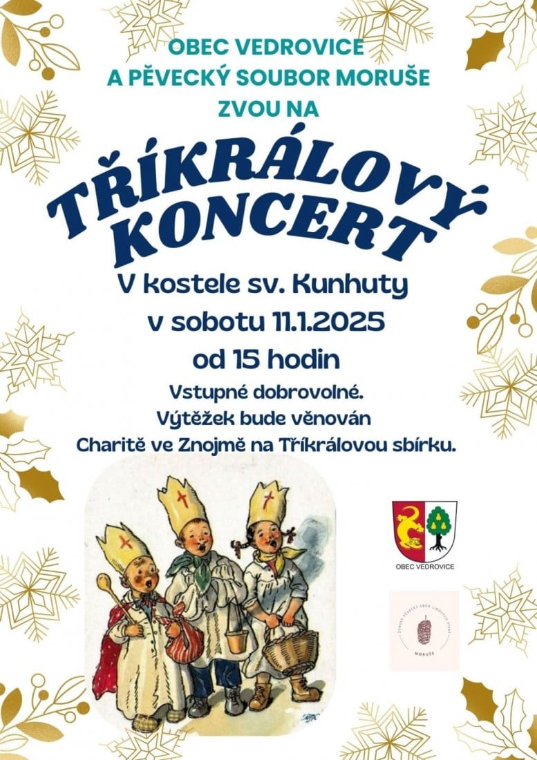 V kostele sv. Kunhuty ve Vedrovicích se od 15 hod. rozezní krásné hlasy ženského pěveckého sboru Moruše. Výtěžek ze slavnostního Tříkrálového koncertu přitom poputuje na Tříkrálovou sbírku organizovanou Charitou Znojmo.