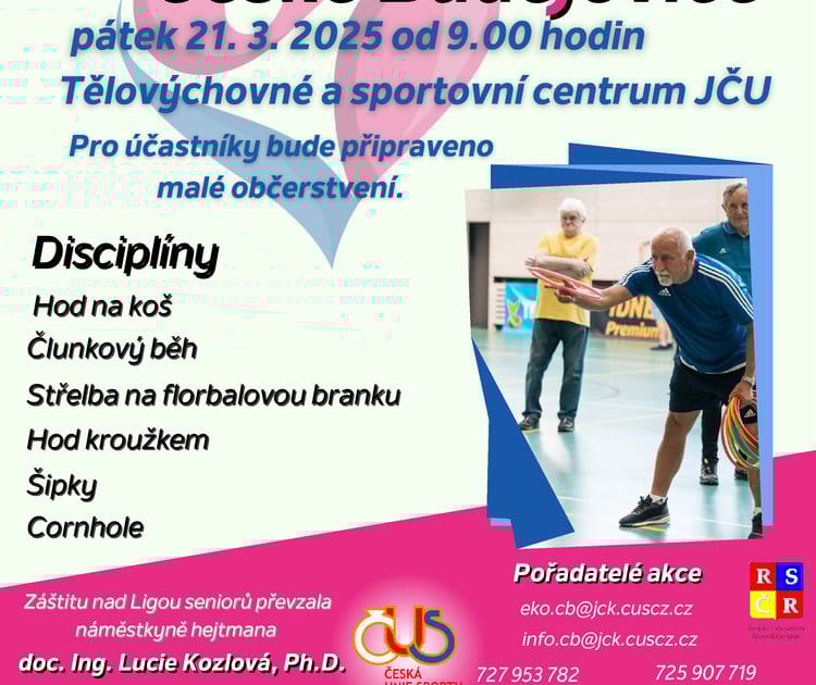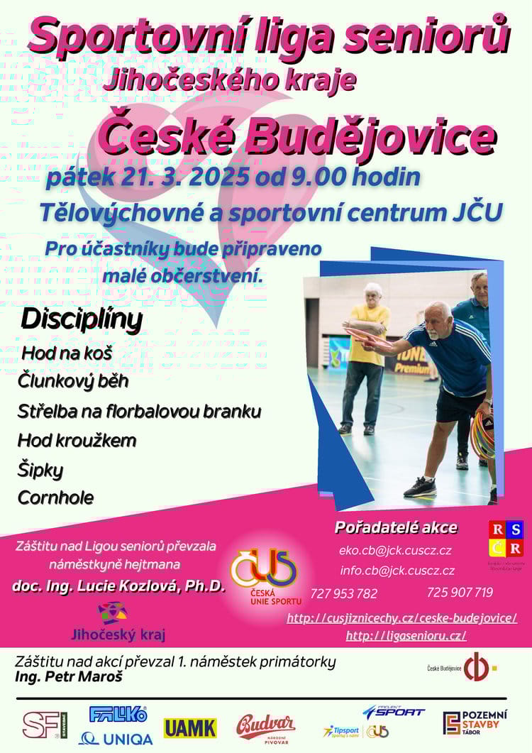 Turnaj Ligy seniorů je jedním z celé série turnajů, které se konají napříč celým Jihočeským krajem. Akce je určená všem aktivním sportovcům nad 60 let a je přístupná zcela zdarma. Pro sportovce je připravené i malé občerstvení. Připraveno je šest soutěžních disciplín, které zvládne úplně každý. Pro přihlášení stačí napsat na uvedený email.