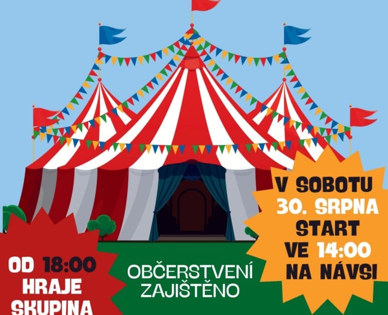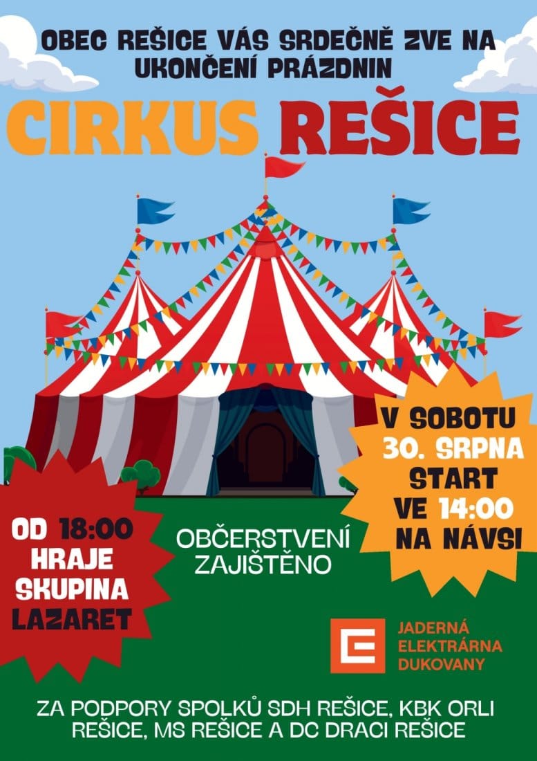 Bohatý kulturní program čeká na malé i velké v CIRKUSU REŠICE. Odpoledne plné zábavy startuje od 14 hod. na návsi. O hudební doprovod se od 18 hod. postará hudební skupina LAZARET. Občerstvení zajištěno.