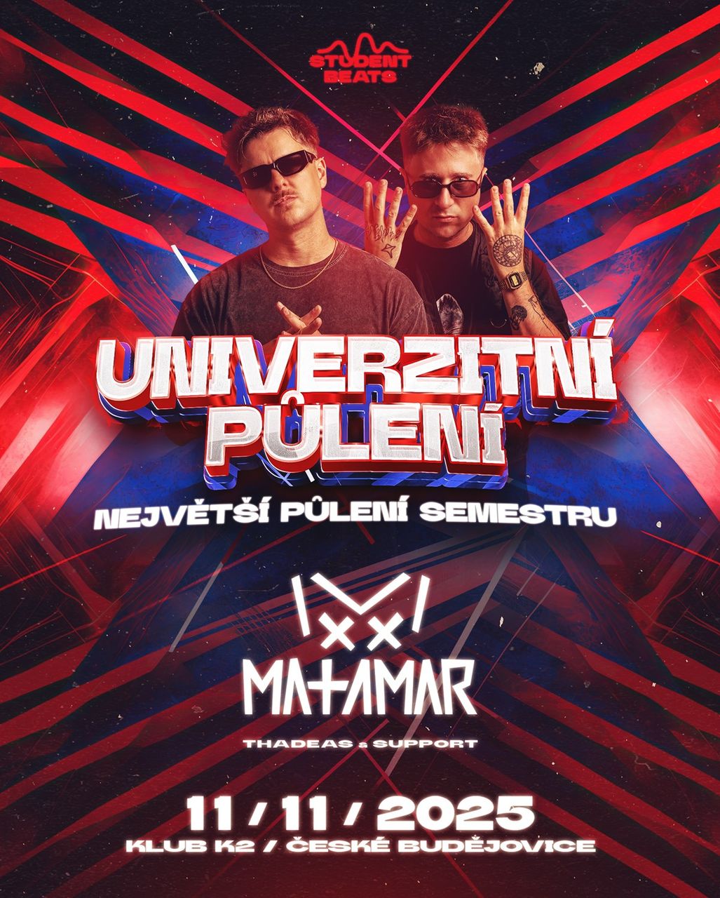 Ve středu 11. 11. 2025 se klub K2 promění v největší studentský mejdan v Budějovicích.