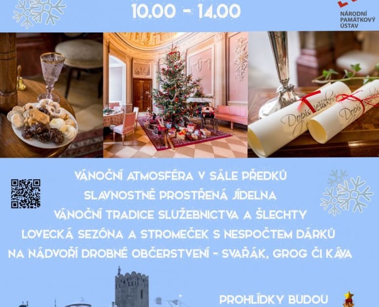 Vánoční prohlídky budou probíhat od 10.00 do 14.00 hod. Budete mít jedinečnou možnost si projít vánoční výzdobu samostatně nebo se připojit k prohlídce, která bude vycházet v pravidelných hodinových intervalech. Průvodce Vám nejen připomene loveckou sezónu, vánoční tradice a jejich historii, ale i freskovou výzdobu sálu předků.