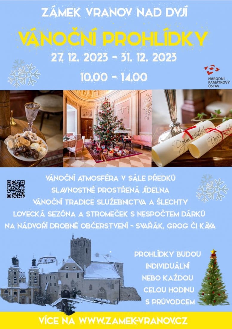 Co Vás čeká během návštěvy vranovského zámku? Není to jen průřez času od podzimu až do nového roku, který Vás čeká v Sále předků, ale i slavnostně prostřená jídelna a symbol Vánoc – ozdobený strom s dárky. Za příznivého počasí bude otevřená také jižní terasa s pohledem do (doufejme) bíle zasněžené okolní krajiny. Pokud Vás vánoční výzdoba ještě dostatečně nenalákala k návštěvě, tak vězte, že to zdaleka není všechno: během vánočního období totiž bude k vidění rovněž mobiliář a předměty vytažené speciálně pro tuto příležitost ze zámeckých depozitářů.