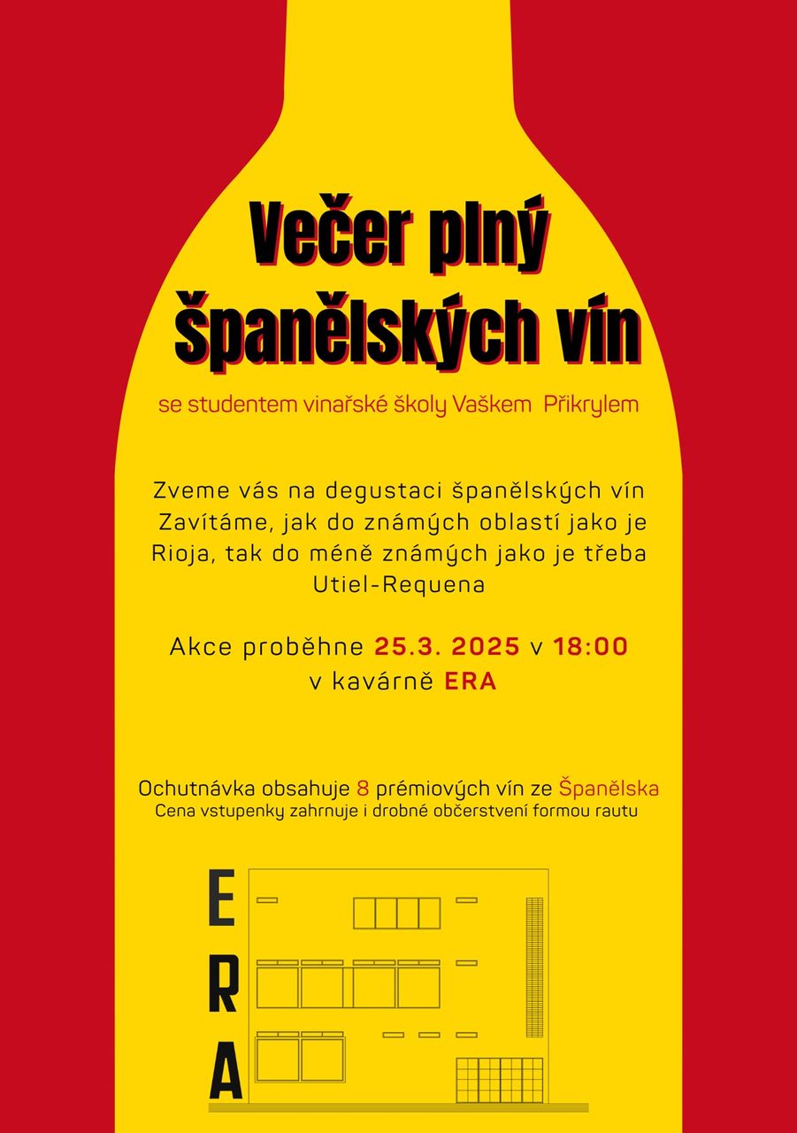 Zveme vás na degustaci španělských vín. Zavítáme, jak do známých oblastí jako je Rioja, tak do méně známých například Utiel-Requena. Akce proběhne 25.3 2025 v 18:00 v kavárně ERA.
