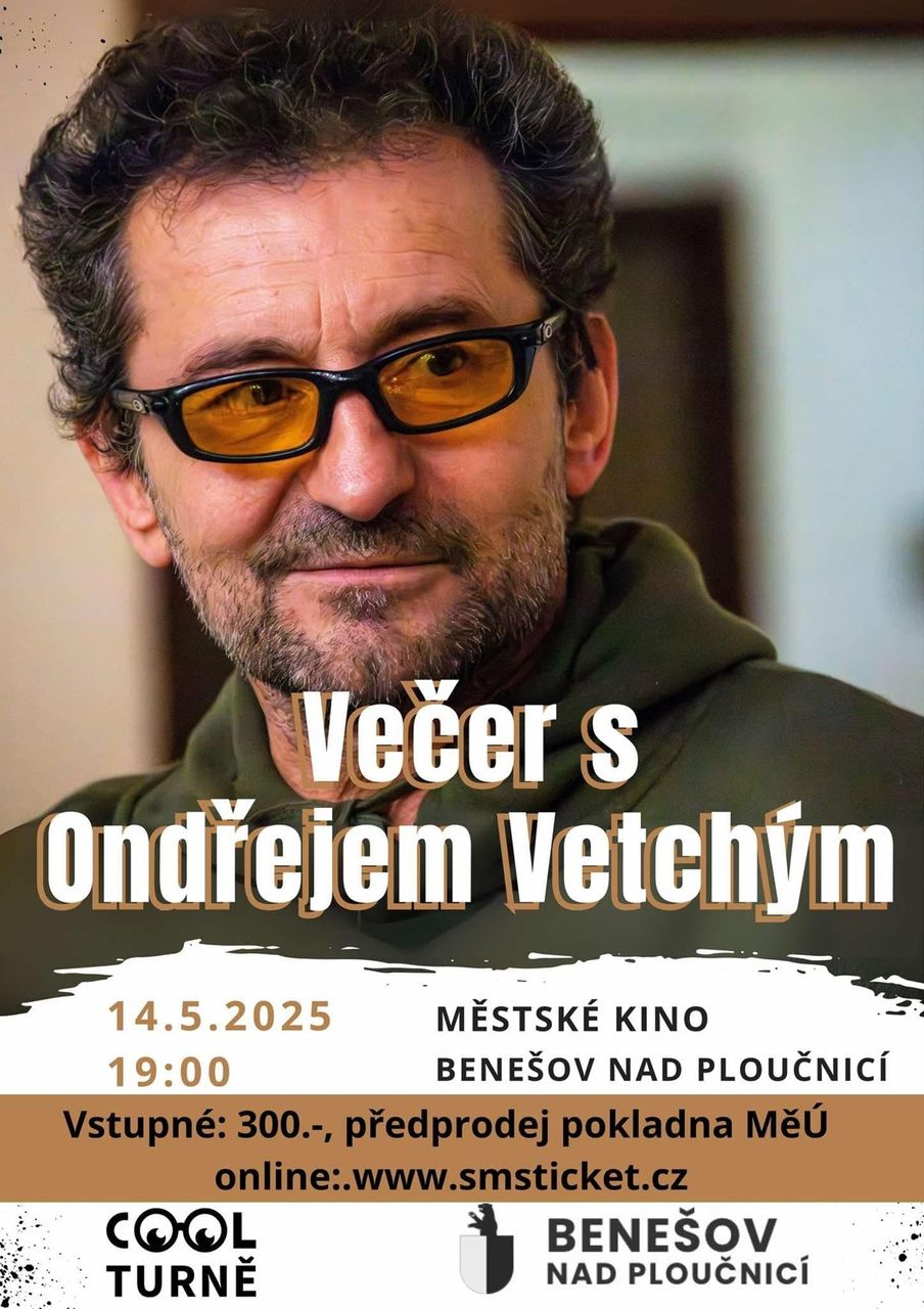 Zveme vás na jedinečnou talk show s jedním z nejlepších českých herců, Ondřejem Vetchým. Moderátorem večera bude PhDr. Jiří Vaniček, který provede diváky zábavným a inspirativním rozhovorem s oblíbeným hercem. Na závěr večera dostanou diváci prostor na své dotazy.