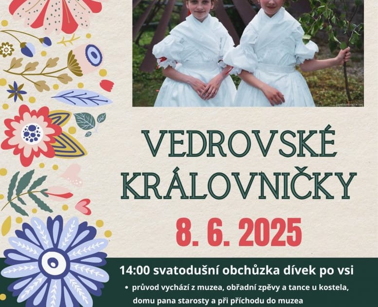 Obnovená folklórní slavnost mladých dívek „královniček“, jejichž krojovaná obchůzka obcí začne ve 14 hod. Průvod vychází z Muzea a informačního centra Vedrovice, a součástí budou i obřadní zpěvy a tance, které proběhnou u kostela, domu pana starosty a při příchodu na dvůr Muzea. Od 15:30 hod. pak bude v muzejním dvoře probíhat posezení pro veřejnost. Vystoupí Moruše, ženský pěvecký sbor lidových písní z Jaroslavic, a Mužáci z Miroslavských Knínic. Ochutnat můžete místní dobroty, jako jsou Vedrovské koláčky nebo Metelče, které připraví dámy z klubu seniorů. Nebude chybět ani místní víno a další občerstvení. Vstupné je dobrovolné.
