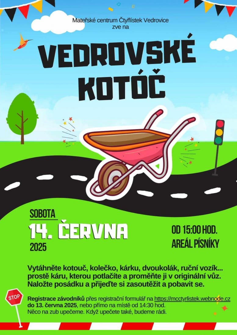 Sport a zábava v jednom, to je rodinná akce ve Vedrovicích, která odstartuje v 15 hod. v areálu Písníky. Vytvořte ze zahradních koleček neboli kotoučů (alias kotóčů), kárek, dvoukoláků, trakařů, ručních vozíků – prostě z kár, které musíte tlačit, své originální vozidlo. Naložte posádku a přijeďte se pobavit. Fantazii se meze nekladou a originalita se cení! Zaregistrujte svůj tým do 13. června 2025 přes on-line formulář: https://forms.gle/psr8E35cnfzbnrRL9 nebo přímo na místě do 14:30 hod.