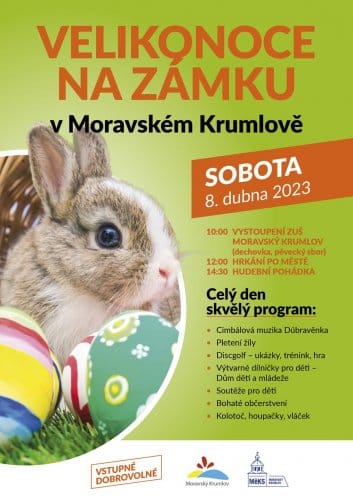 Celodenní velikonoční program nabídne tradiční moravský folklór s cimbálovou muzikou Dúbravěnka, pletení žíl (pomlázek) či výtvarné dílničky pro děti pod taktovkou místního Domečku – Domu dětí a mládeže. Návštěvníci se mohou těšit i na vystoupení ZUŠ Moravský Krumlov v 10 hod. a na velikonoční hrkání po městě, které začne v pravé poledne (vychází se ze zámku). Odpoledne si užijete s hudební pohádkou, děti potěší kolotoč, houpačka nebo vláček. Občerstvení zajištěno.