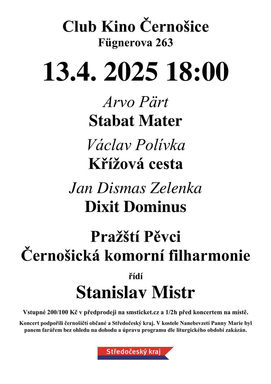 Na Květnou neděli 13.4. v 18h zazní v Club Kině Černošice Stabat Mater Arvo Pärta, Křížová cesta Václava Polívky a Žalm č. 109 Dixit Dominus Jana Dismase Zelenky v podání Pražských pěvců a Černošické komorní filharmonie pod vedením Stanislava Mistra.