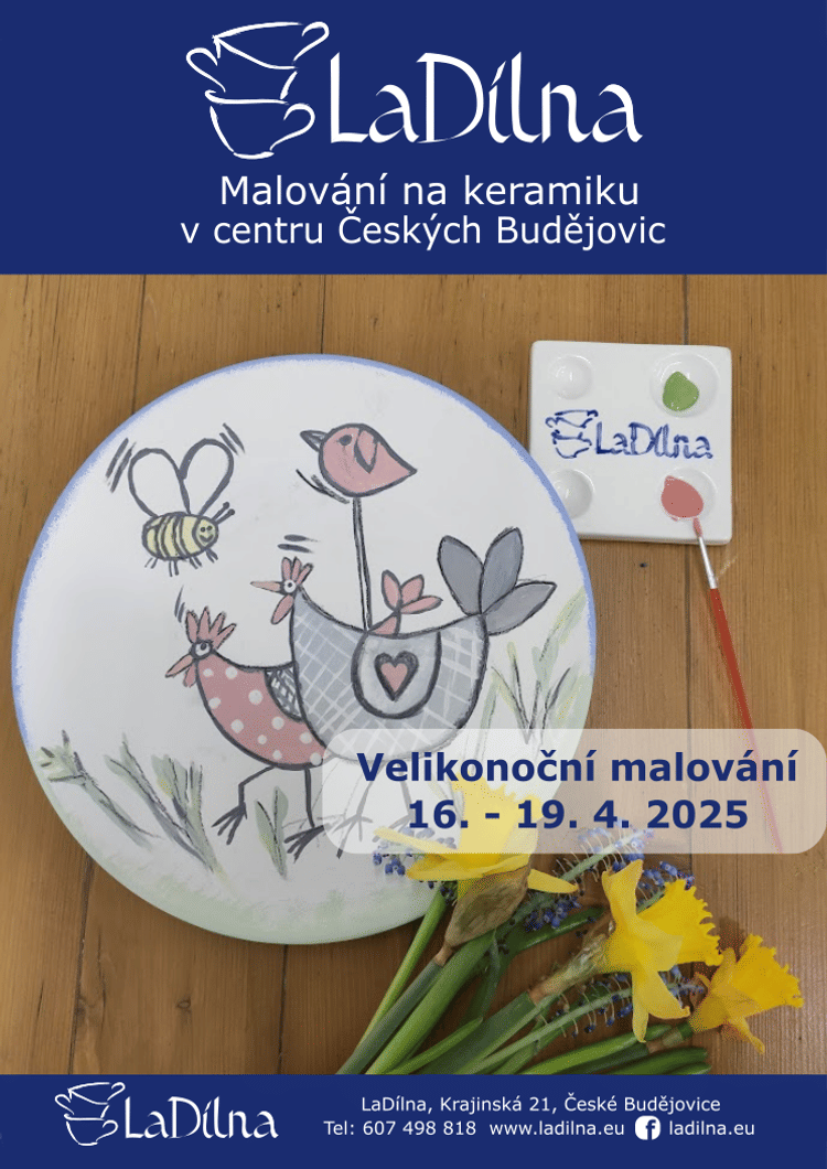 Nalaďte se do jara a vyrobte si originální velikonoční dekoraci, kraslice, co vydrží, nebo jarní doplňky do domácnosti. Pro Vaše velikonoční tvoření máme připravené nové keramické kousky s motivy jara a Velikonoc a spoustu barevných glazur. Tvoření u nás je vhodné pro všechny věkové kategorie. Máme široký výběr keramických tvarů a barevných glazur a se vším rádi poradíme. Techniky pro dozdobení jsou vhodné pro děti i dospělé, k dispozici je nespočet pomůcek, šablonek a razítek s jarními a velikonočními motivy. Najdete nás v centru Českých Budějovic. Máme otevřeno dle pravidelné otvírací doby od středy do pátku 10 – 18 hodin, v sobotu 9 – 13 hodin. Na malování je potřeba počítat dvě hodiny času. Pro větší skupiny doporučujeme rezervace míst předem.