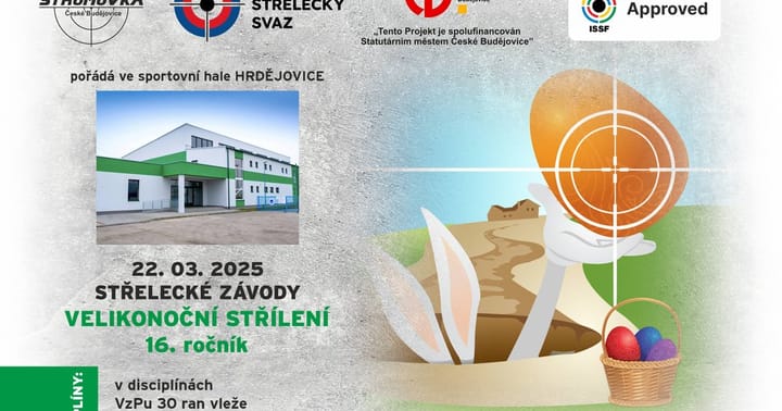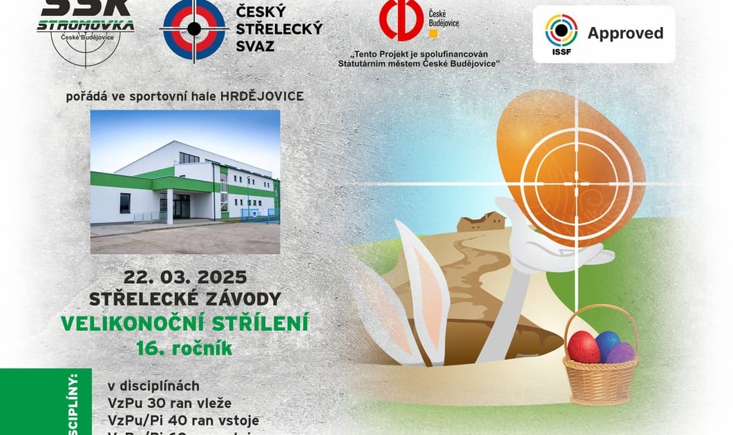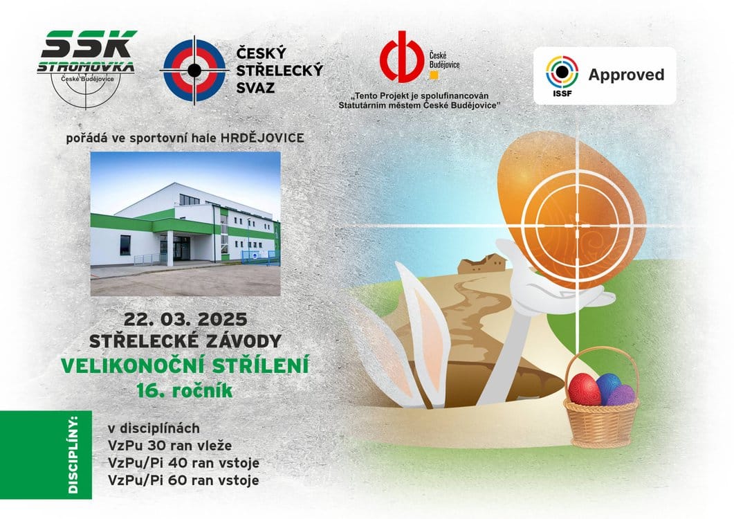 Velikonoční střílení – 16.ročník Sportovní hala Hrdějovice SSK Stromovka České Budějovice srdečně zve na sportovní událost, jedinečnou v kraji. Očekává se příjezd sportovních střelců z celé České republiky, jako prověření před nadcházejícím Mistrovsví ČR. Střílí se na unikátní interaktivní elektronické terčové zařízení schválené mezinárodní organizací ISSF pro olympijské sporty ve sportovní střelbě. Zveme všechny diváky k vytvoření rušné atmosféry, kterou střelci zažívají na vrcholných závodech. Přijďte a ochutnejte atmosféru olympijského sportu. v disciplínách: VzPu 30 ran vleže VzPu/Pi 40 ran vstoje VzPu/Pi 60 ran vstoje „Tento Projekt je spolufinancován Statutárním městem České Budějovice“ Propozice Druh soutěže: Soutěž jednotlivců ze vzduchové pušky/pistole Pořadatel: ČSS,z.s. SSK Stromovka České Budějovice Datum konání: sobota 22.03.2025 Místo konání: Sportovní hala Hrdějovice Organizační výbor: SSK Stromovka České Budějovice Disciplíny: 1.VzPu 30 ran vleže s oporou do 12 let 2.VzPu 30 ran vleže do 12 let 3.VzPu 30 ran vleže do 14 let 4.VzPu/VzPi 40 ran vstoje do 18 let 5.VzPu/VzPi 60 ran vstoje junioři, ženy, muži Časový rozvrh: VzPu v KD Borek Nástup – nástřel – závod – konec VzPu 30 1sm. 07:50 – 07:00 – 07:10 – 07:40 VzPu 30 2sm. 08:50 – 08:00 – 08:10 – 08:40 VzPu 30 3sm. 09:50 – 09:00 – 09:10 – 09:40 VzPu/Pi 40 4sm. 09:50 – 10:00 – 10:15 – 11:05 VzPu/Pi 60 5sm. 11:15 – 11:25 – 11:40 – 12:55 Případná 6 směna bude doplněna. Předběžný program nástupů na jednotlivé směny, upozorňujeme na možné posouvání v časech, které se mohou zkracovat. Doporučujeme min. příjezd o směnu dříve. Vyhlášení výsledků: do 30 minut po ukončení střelby Startovné: 200,-Kč na disciplínu Ceny: závodníci do 5.místa budou oceněni Zároveň jde o poslední 1. kolo soutěží „Putovního poháru CB SERVIS CENTRUM“ pro disciplíny 2. a 3. VzPu 30 a „Putovní pohár SOLNICE“ pro disciplínu 4. a 5.VzPu 40,60 vstoje, počítá se prvních 40 ran. Krajský přeborník Nejlepší závodník, který je členem SSK na území Jihočeského kraje v disciplínách 2.a 3. získá „Titul PŘEBORNÍK JIHOČESKÉHO KRAJE“ pro rok 2024 v kategorii VzPu 30 Zbraně a střelivo: Vlastní, vzduchové pušky do max.7.5 joul pro olympijskou disciplínu Srdečně zve sportovní střelecký klub – SSK Stromovka České Budějovice