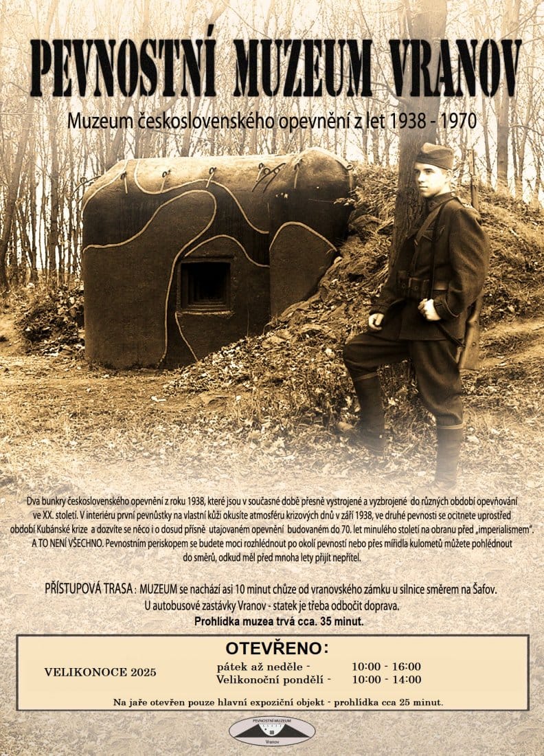 Nová sezóna v roce 2025 odstartuje v Pevnostním muzeu Vranov o Velikonocích. Otevřeno bude od pátku až do neděle, ale pouze v hlavním expozičním objektu. Další budou zpřístupněny až v hlavní letní sezóně. Muzeum tvoří dva objekty bývalého válečného opevnění ze 30. let 20. století a navazující krátká naučná stezka vedoucí k dalšímu objektu. První z nich je uveden do předpokládaného stavu v roce 1938 včetně originální výstroje. Komentované prohlídky v sezóně zajišťuje odborný průvodce – v červnu obvykle pouze o víkendech, v červenci a srpnu pak prakticky denně.