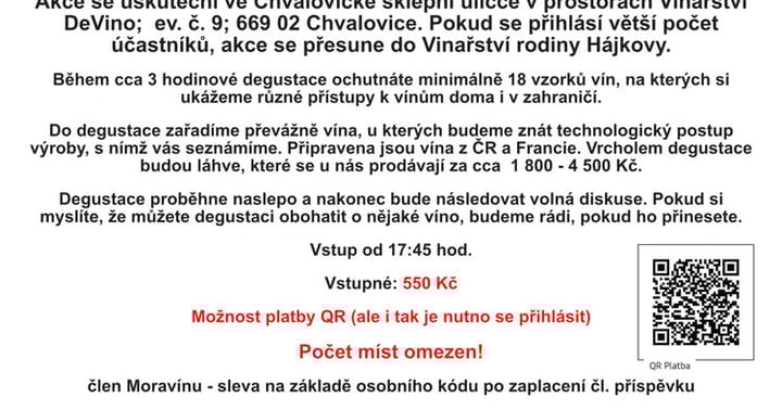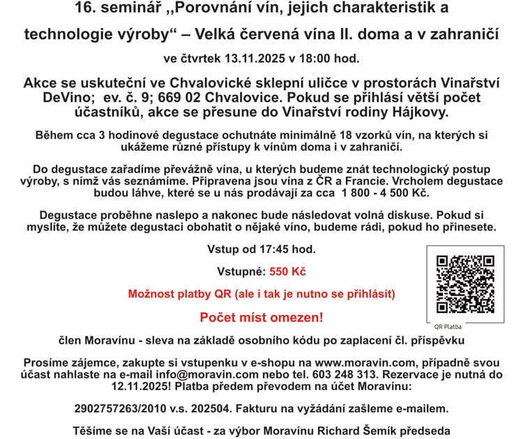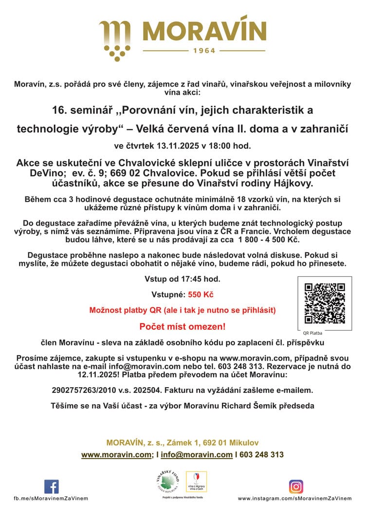Moravín, z.s. pořádá pro své členy, zájemce z řad vinařů, vinařskou veřejnost a milovníky vína akci: