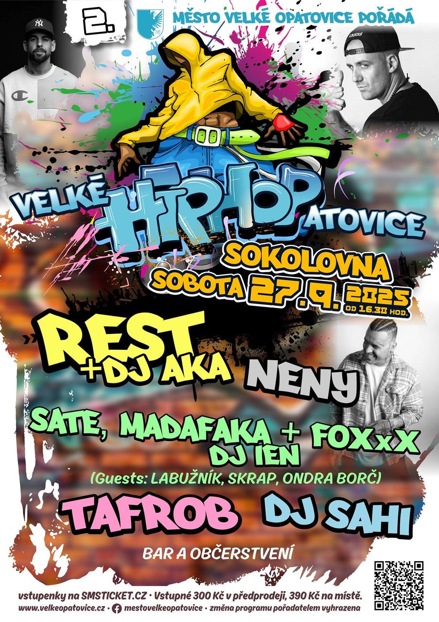 2. ročník hip hop/rap akce Velké HIP HOPatovice, tentokrát v sokolovně ve Velkých Opatovicíc na Blanensku. Vystoupí známá jména rapové a hiphopové scény.