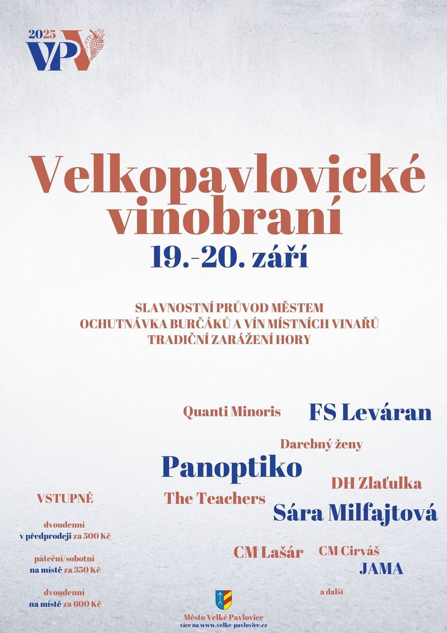 Velkopavlovické vinobraní má mnohaletou tradici. Nabízí bohatý kulturní program zaměřený na místní folklór, ale také na populární, popř. rockovou hudbu. V letošním roce vystoupí CM Lašár, CM Cirváš, Darebný ženy, DH Zlaťulka, ale také se můžete těšit na slovenský FS Leváran, dětské folklórní soubory a samozřejmě na slavnostní průvod místní krojované chasy ulicemi města.