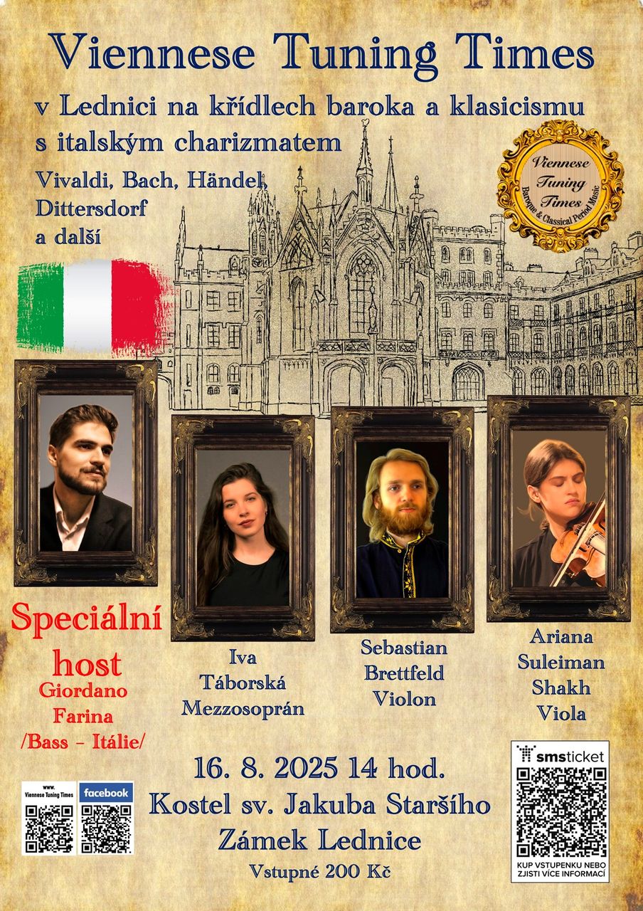 V sobotu 16 srpna 2025 od 14 hodin zazní kostele sv. Jakuba Staršího v Lednici koncert komorního souboru Viennese Tuning Times, který nabídne odpoledne plné okouzlujících árií a virtuózních skladeb z pokladnic barokních a klasicistních mistrů – Vivaldiho, Händela, Bacha, Mozarta, Dittersdorfa, Spergera a dalších.