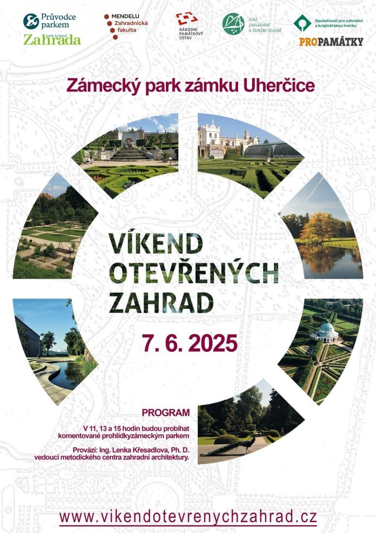 Uherčický zámek se letos připojuje k mezinárodní akci Víkend otevřených zahrad, která vždy počátkem června zve do zelených oáz nejrůznějších parků a zahrad. V rámci této akce se v sobotu 7. června uskuteční komentované prohlídky Uherčické zámecké zahrady, a to v 11, ve 13 a v 15 hod. Provázet bude Ing. Lenka Křesadlova, Ph.D. – vedoucí Centra zahradní kultury NPÚ v Kroměříži. Na tyto netradiční prohlídky však doporučujeme rezervaci míst předem.