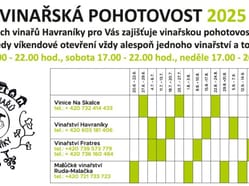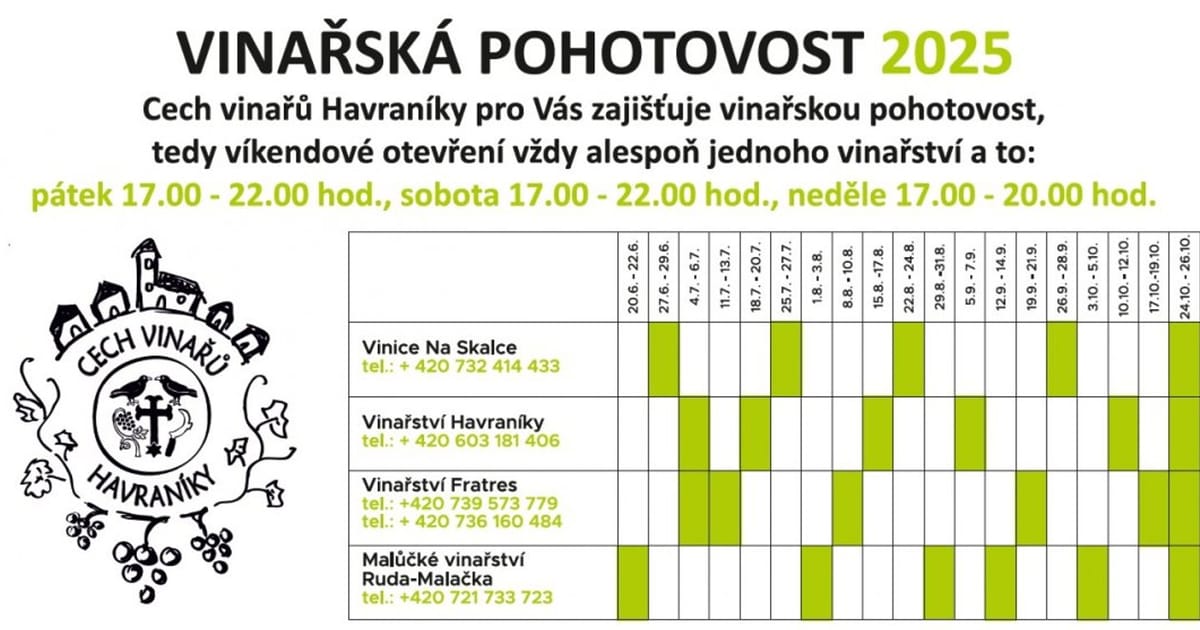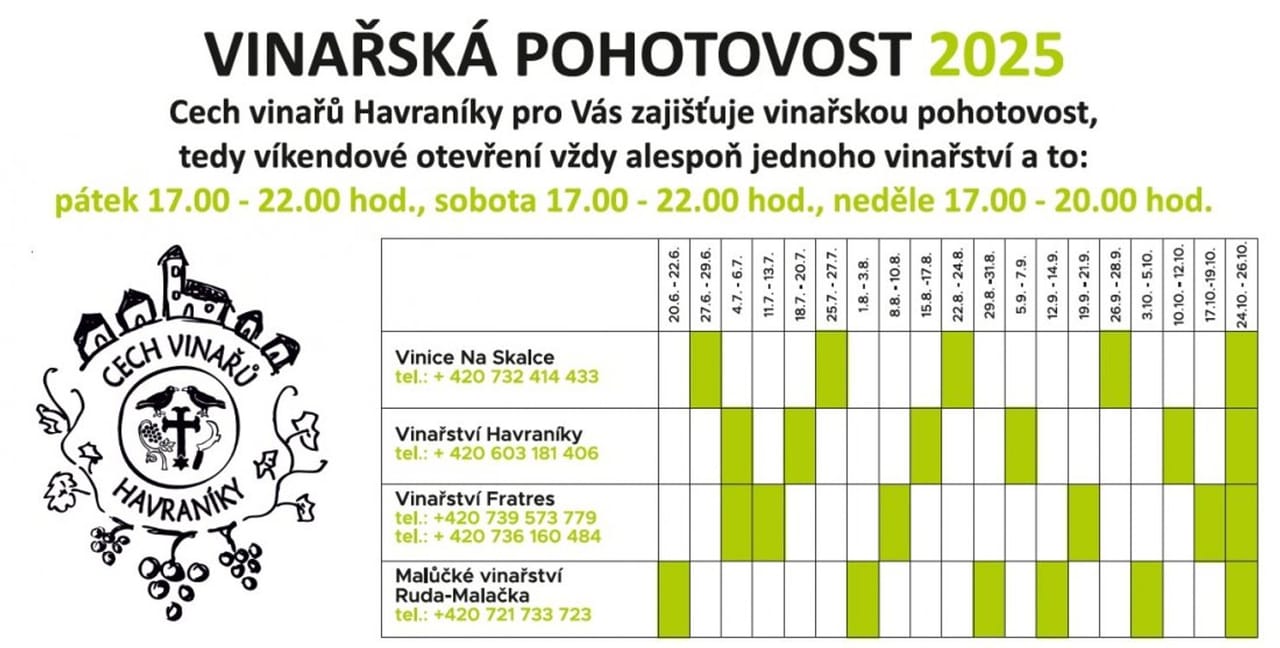 Cech vinařů z Havraníků pro Vás připravil i pro letošní sezónu svou „Vinařskou pohotovost“. Díky této unikátní službě máte jistotu, že každý víkend během sezóny najdete v Havraníkách otevřeno minimálně jedno vinařství. Víkendové vinařské pohotovosti fungují od 20. června až do 26. října, a to vždy od pátku do neděle. Během celé sezóny se střídají čtyři místní vinařství.