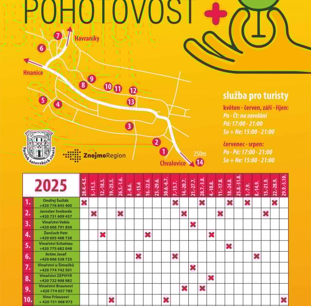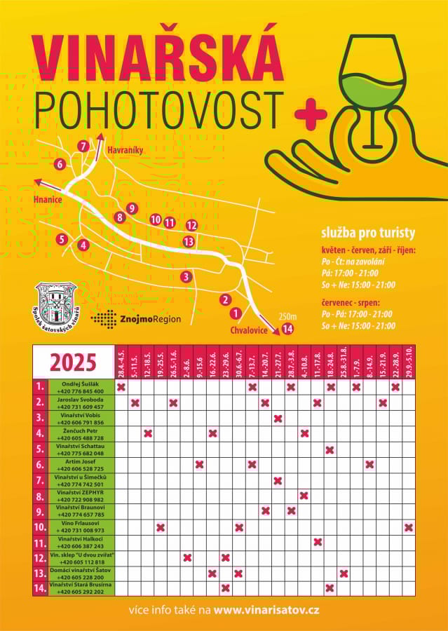 Nejen v prázdninových měsících se o vás v Šatově postarají členové Spolku šatovských vinařů. Kterýkoli den v týdnu, od dubna až do začátku října, najdete v šatovských sklepních uličkách vždy minimálně jeden sklep, který „drží pohotovost“ a je připraven vás na místě osvěžit nebo vás vybavit lahvemi zdejšího lahodného vína. V týdenních službách se tu pravidelně střídá 14 vinařství.