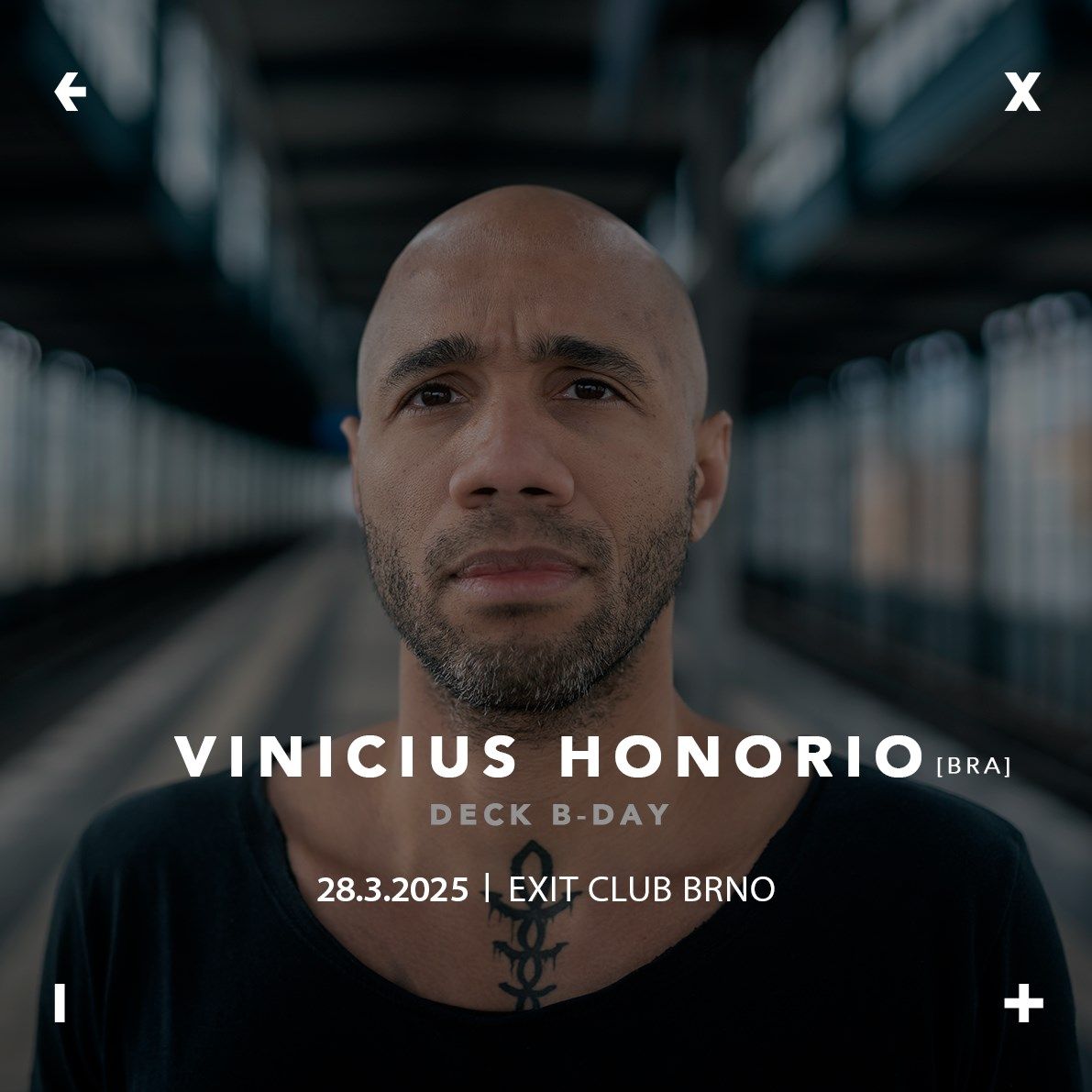 V pátek 28. 3. dorazí do EXIT Club Brno výjimečný host – brazilský DJ a producent Vinicius Honorio, jehož tvorba získala uznání od světových jmen jako Len Faki, Ben Klock nebo Rødhåd. Připravte se na noc plnou strhujících beatů a temného, hypnotického soundu. Při této příležitosti navíc oslaví svoje narozky rezident DJ Deck, takže tohle si rozhodně nemůže nechat ujít žádný milovník techna!