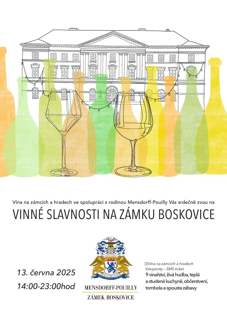 Srdečně vás zveme na druhý ročník, který se bude odehrávat v pátek 13. 6. od 13.00 hod. Tak jako loni se můžete těšit na skvělá moravská vinařství, teplou a studenou kuchyni, živou hudbu a hlavně skvěle strávené odpoledne. Návštěvníci mají možnost si donést vlastní skleničku, nebo bude samozřejmě možnost zakoupit skleničku na místě.