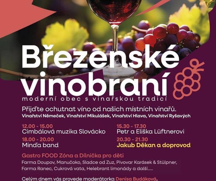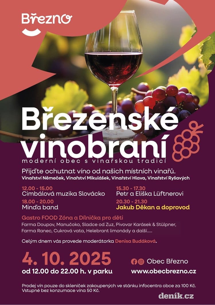 s velkým potěšením vás jménem obce Březno i místních organizátorů zveme na letošní Březenské vinobraní, které se uskuteční v sobotu 4. října 2025 v krásném prostředí obecního parku v Březně. Akce bude probíhat od 12:00 do 22:00 hodin.