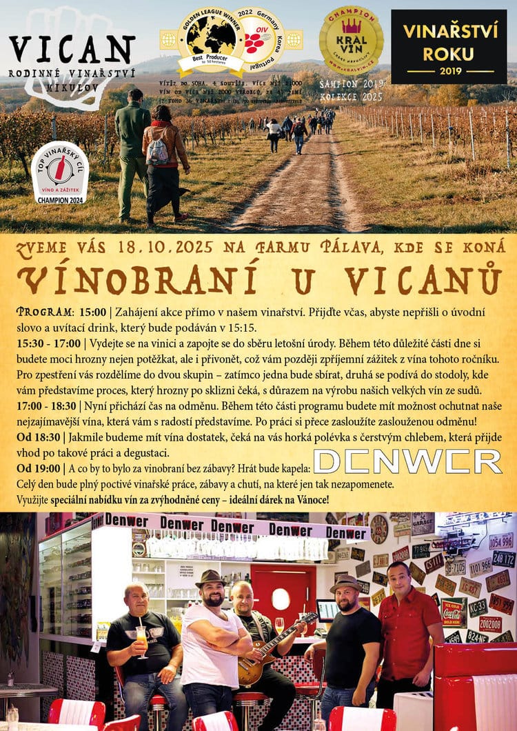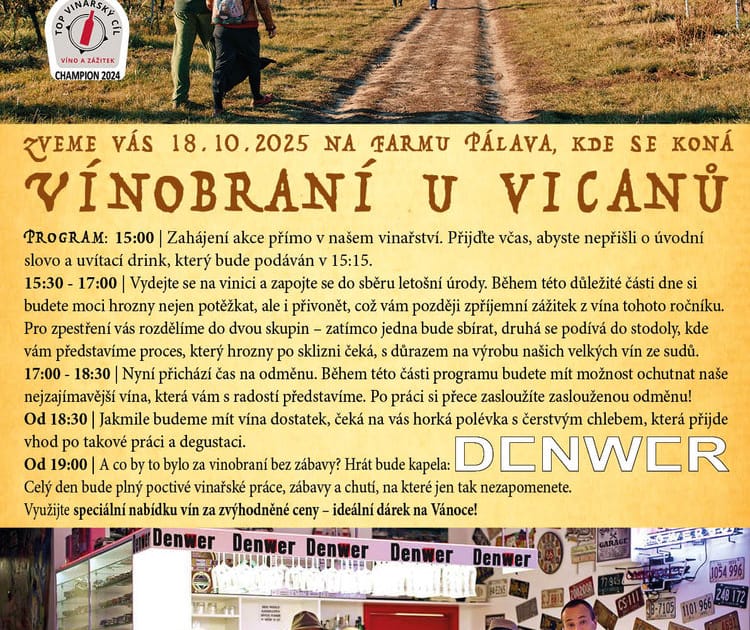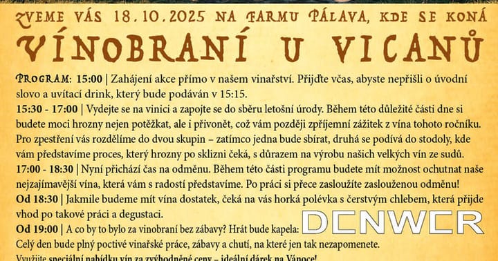 Milí přátelé, srdečně vás zveme na naši tradiční akci Vínobraní u Vicanů, která se uskuteční v sobotu 18. října od 15.00 hod. v našem vinařství. Celý den bude plný poctivé vinařské práce, zábavy a chutí, na které jen tak nezapomenete.