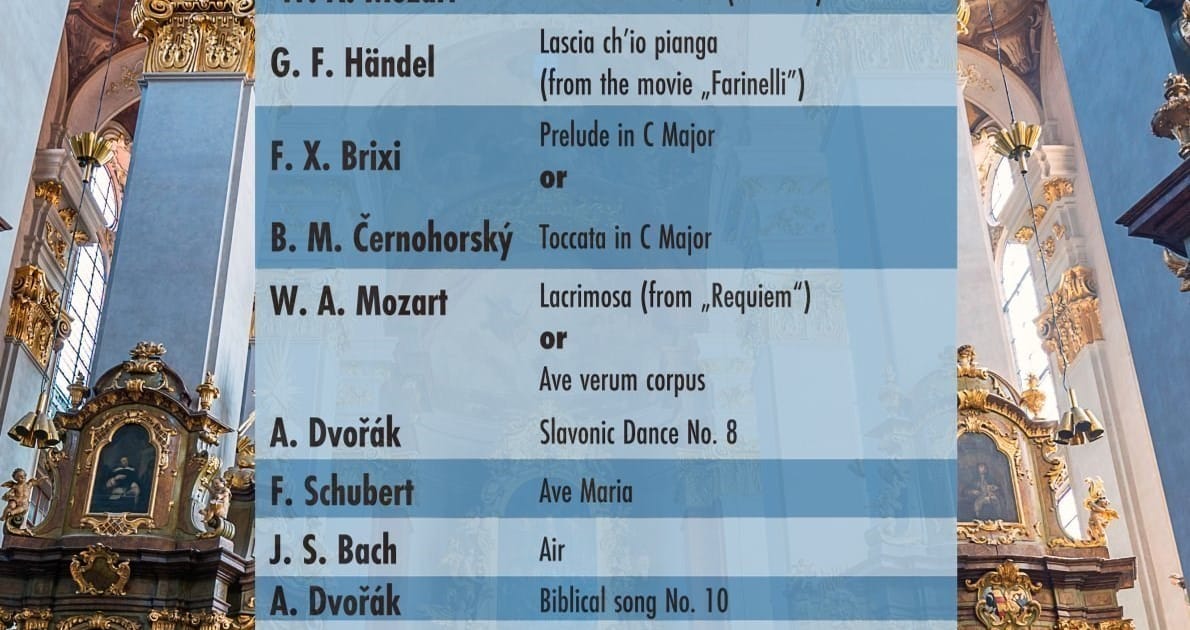 F. X. Brixi – Prelude in C Major or B. M. Černohorský – Toccata in C Major W. A. Mozart – Lacrimosa (from „Requiem“) or Ave verum corpus