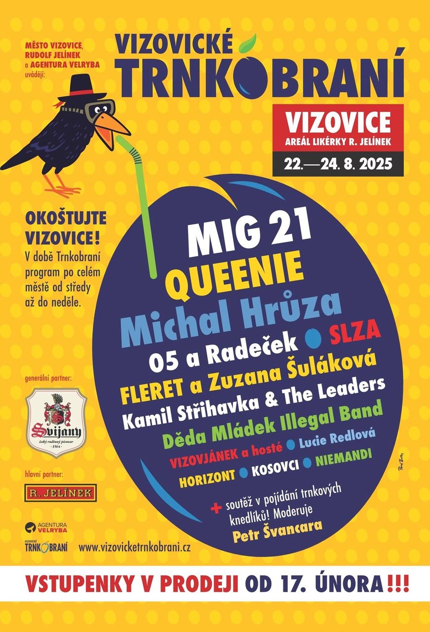 Třídenní Vizovické Trnkobraní přinese nabitý program plný hudby, zábavy a tradičních specialit. Na pódiu se představí MIG 21, Queenie, O5 a Radeček, Michal Hrůza, Kamil Střihavka, Slza, Fleret a mnoho dalších. Nebude chybět ani legendární soutěž v pojídání trnkových knedlíků, kterou provede Petr Švancara, kulinářská show Vaříme z trneknebo škola výroby frgálů. A to je jen začátek!