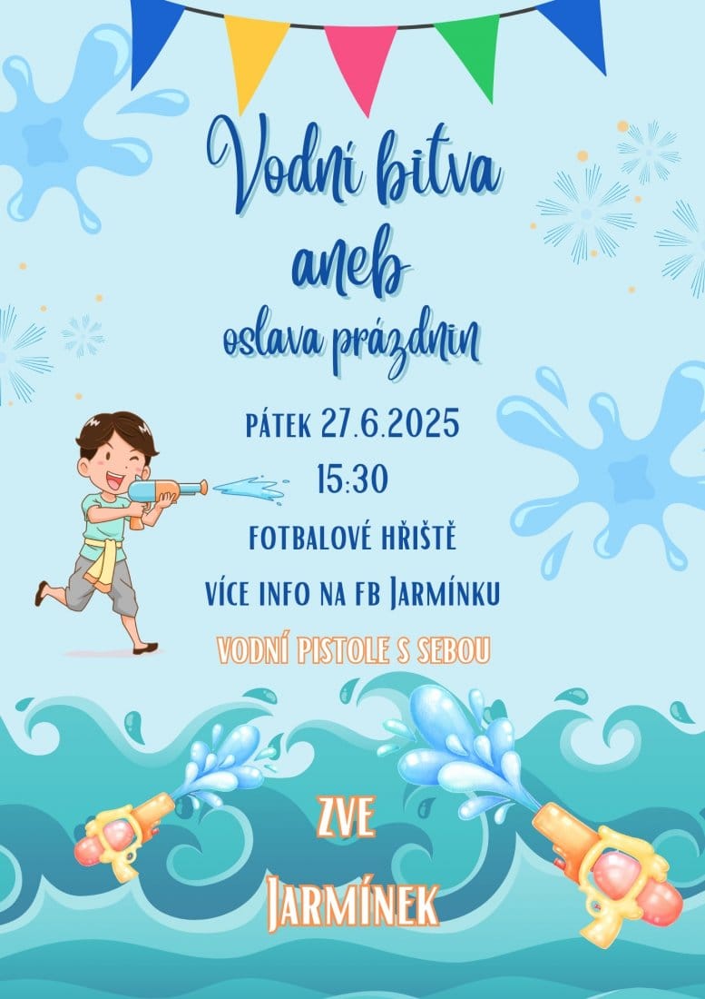 Spolek jaroslavických maminek Jarmínek zve na oslavu začátku letních prázdnin, a to formou obrovské vodní bitvy pro děti i dospělé. Akce se koná na vrchním fotbalovém hřišti a krom vodních pistolek doporučujeme vzít si s sebou i náhradní oblečení a ručník. Akce je vhodná pro děti všech věkových kategorií.