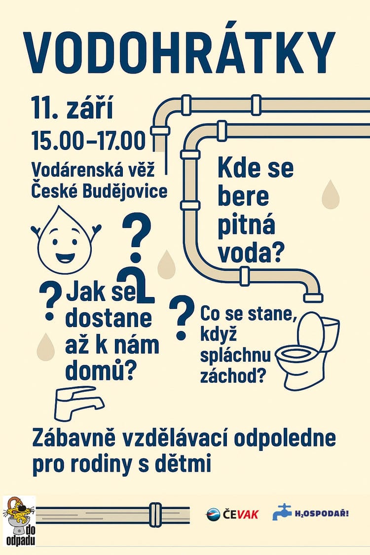Kde se bere pitná voda a co se s ní děje dál? Víš, proč se nemají zbytky jídel splachovat do záchodu? Společnost ČEVAK a.s. spolu s organizací H2OSPODAŘ připravila v areálu vodárenské věže zábavně-naučný program určený pro rodiče s dětmi.