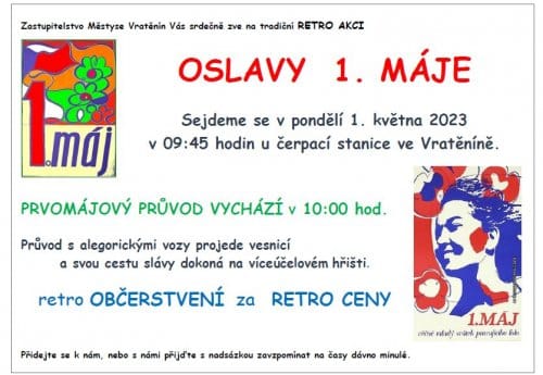 Přijďte si s nadsázkou připomenout staré časy a pobavit se na recesistických oslavách 1. máje ve Vratěníně. Prvomájový průvod s alegorickými vozy vychází v 10 hod. (sraz v 9:45 hod. u čerpací stanice) a svou cestu slávy dokoná na místním víceúčelovém hřišti. Retro akce však nabídne i retro občerstvení za retro ceny!