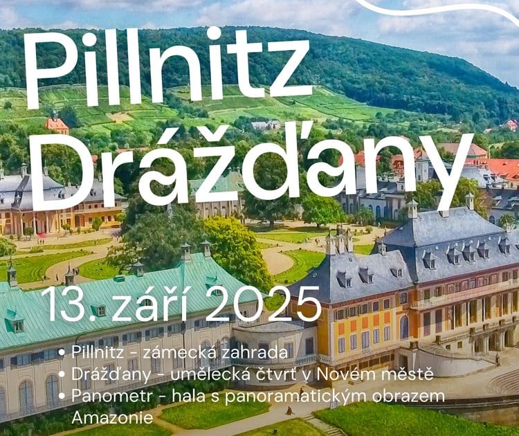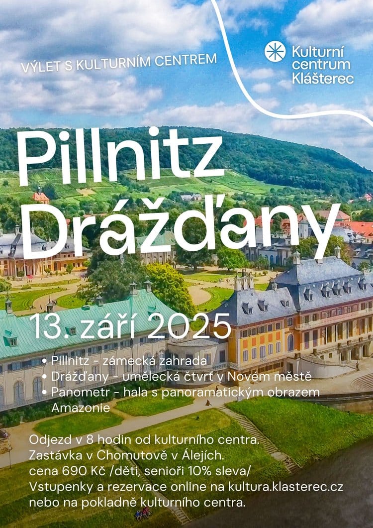 Výlet do Pillnitz a Drážďan – 13. září 2025Zveme vás na výlet za hranice všedních dnů! Navštívíme zámek a zahrady v Pillnitzu, uměleckou čtvrť v Novém Městě v Drážďanech a jedinečný Panometr s panoramatickým obrazem Amazonie. Odjezd v 8:00 od kulturního centra, se zastávkou v Chomutově v Alejích. Cena: 690 Kč / děti a senioři sleva 10 %. Vstupenky a rezervace online na kultura.klasterec.cz nebo na pokladně kulturního centra.