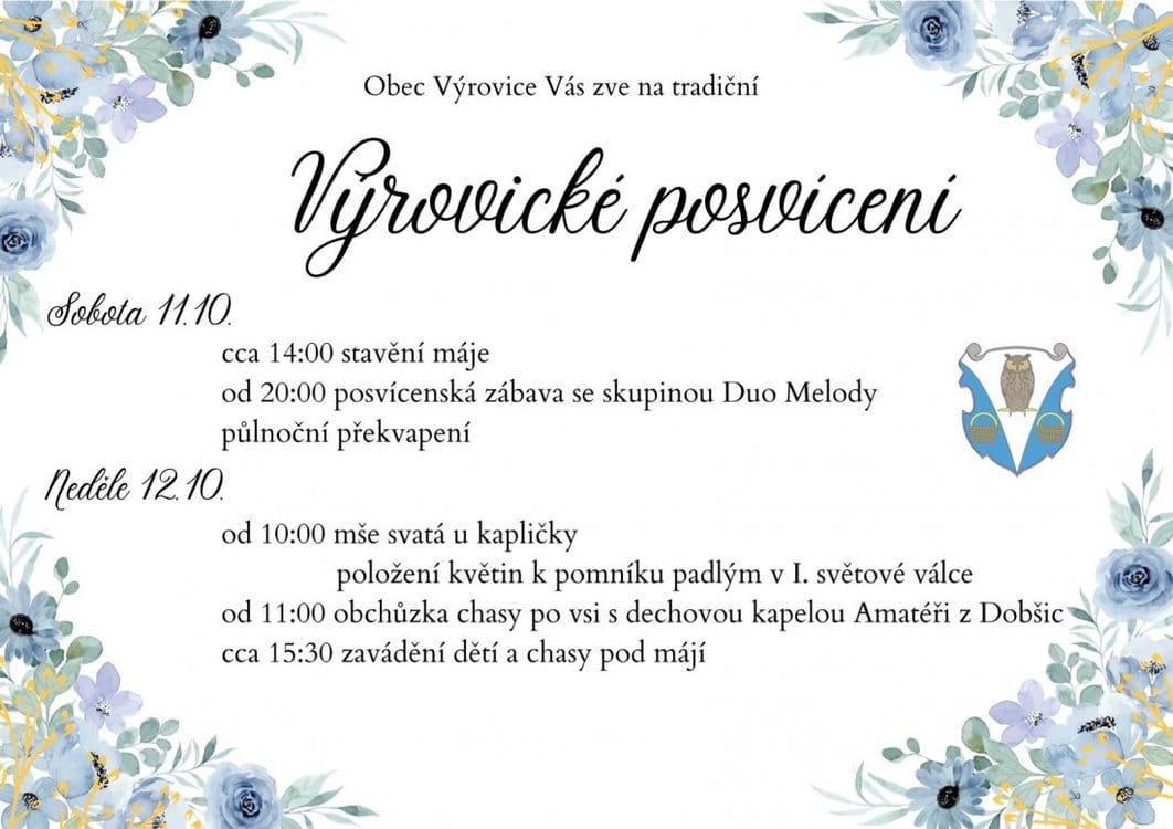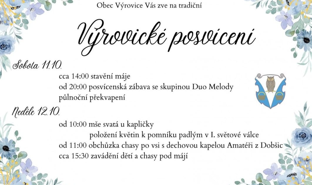 Tradiční Výrovické posvícení zahájí sobotní stavění Máje a večerní zábava, na které v neděli naváže slavnostní mše svatá, obchůzka chasy po vsi s dechovou hudbou i odpolední zavádění pod Májí.