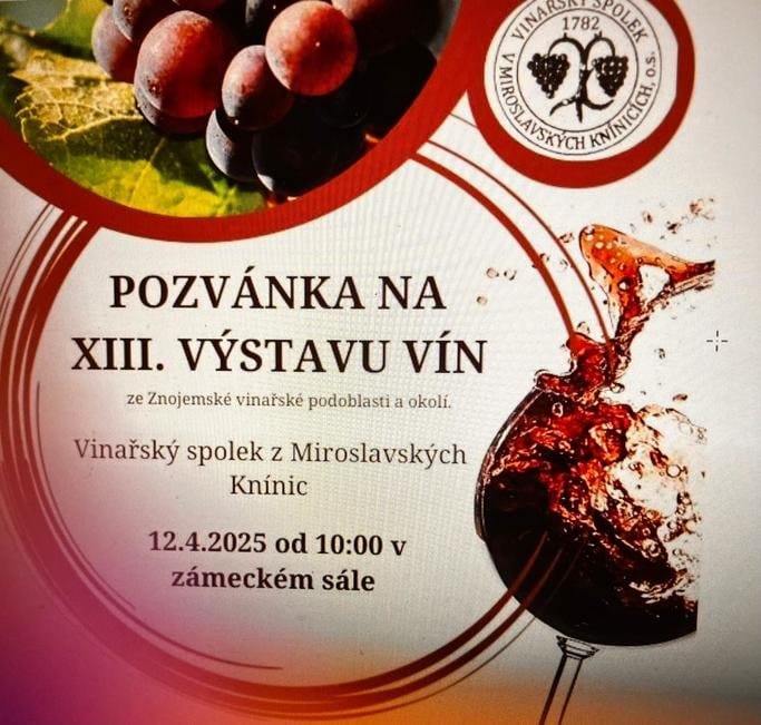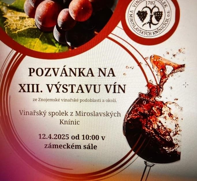 Vinařský spolek Miroslavské Knínice zve v sobotu 12. dubna na 13. ročník výstavy vín ze Znojemské vinařské podoblasti. Program výstavy bude probíhat od 10. hodin v zámeckém sále v Miroslavských Knínicích.