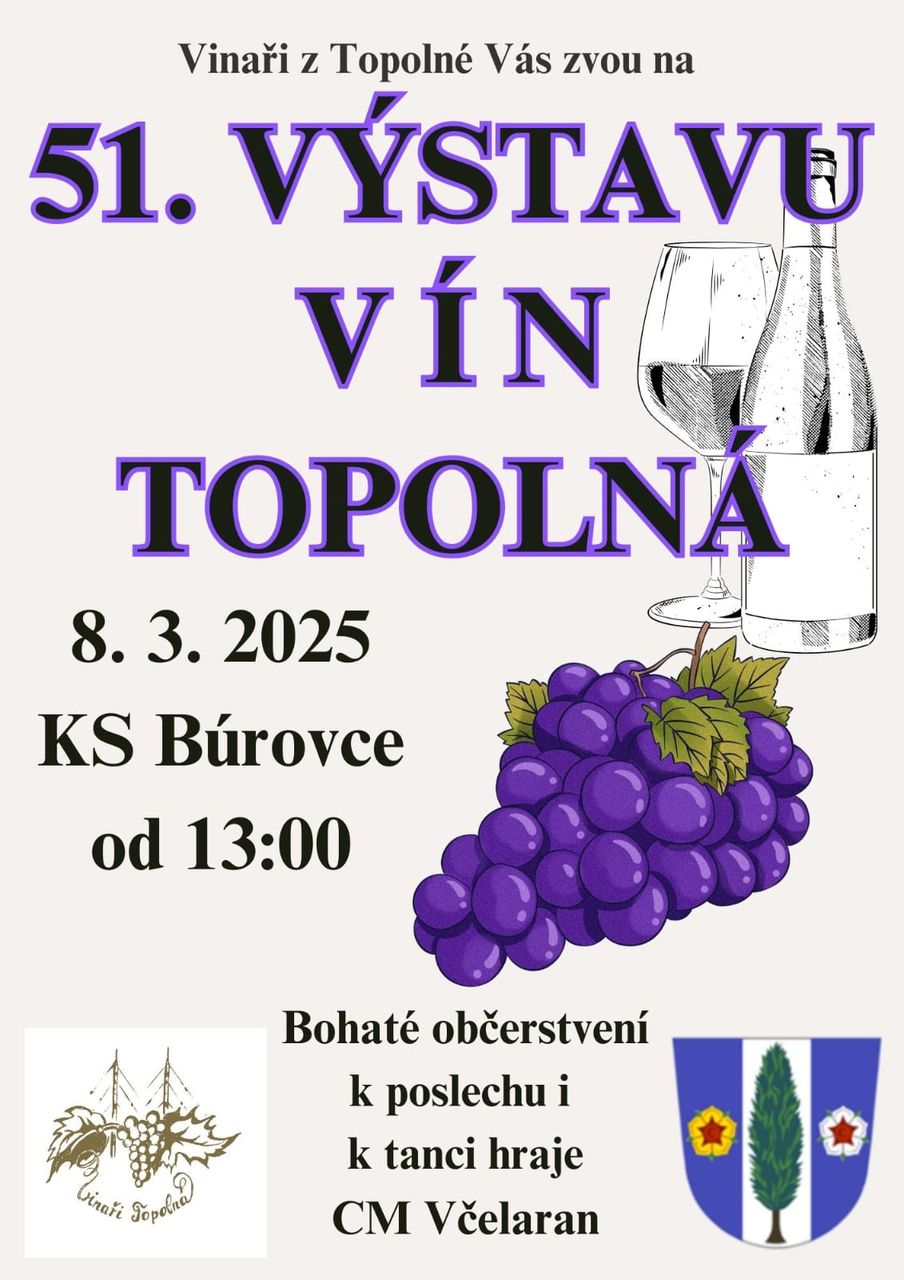 Srdečně vás zveme na tradiční, letos již 51. výstavu vín v naší malebné obci Topolná, která se koná 8. března 2025.
