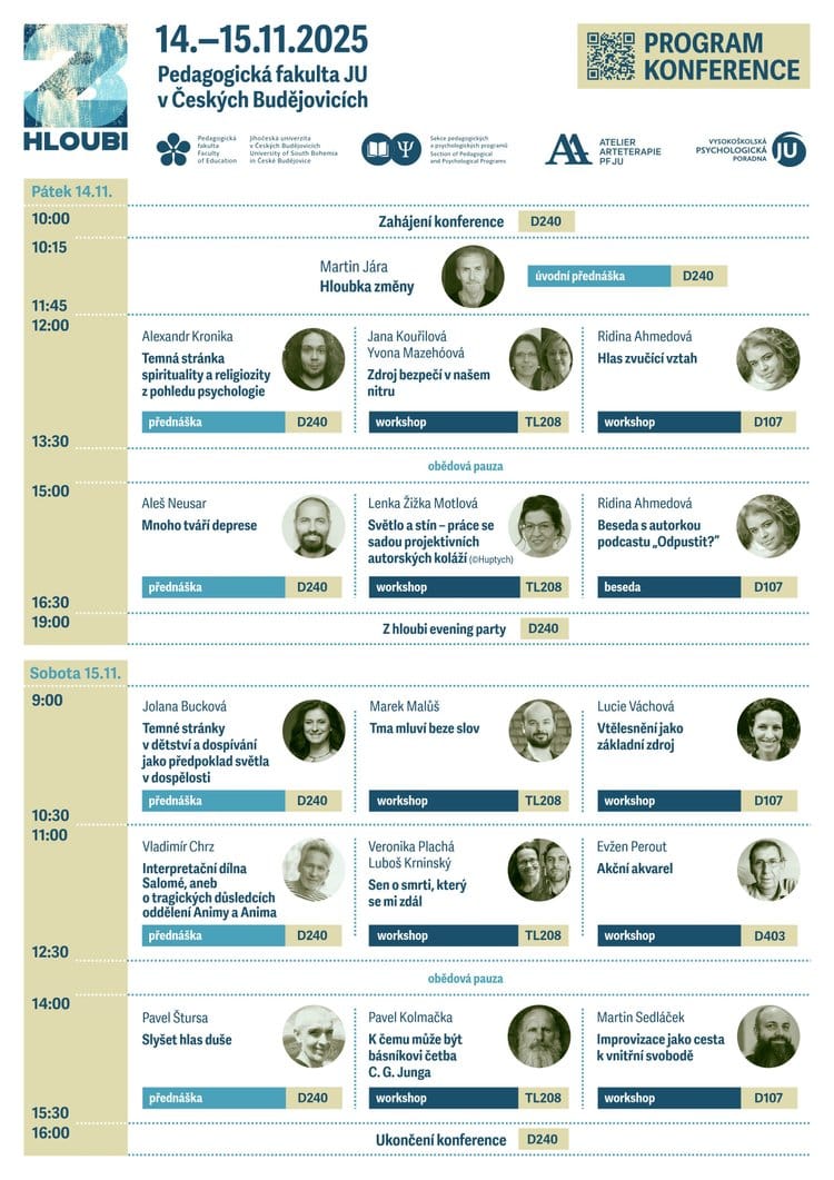 V rámci konference budou nabízeny jak přednášky na daná témata, tak workshopy, ve kterých si jejich účastníci budou moci jednotlivé přístupy vyzkoušet. V rámci programu poběží souběžně vždy jedna přednáška a dva workshopy, ze kterých si účastníci budou moci vybrat. Příspěvky se zaměřují na vnitřní obsahy a jejich integraci skrze reflektovaný kontakt s tělem a pohybem, práci s dechem, hlasem, výtvarným projevem a kontaktem se snovými a imaginativními obrazy.