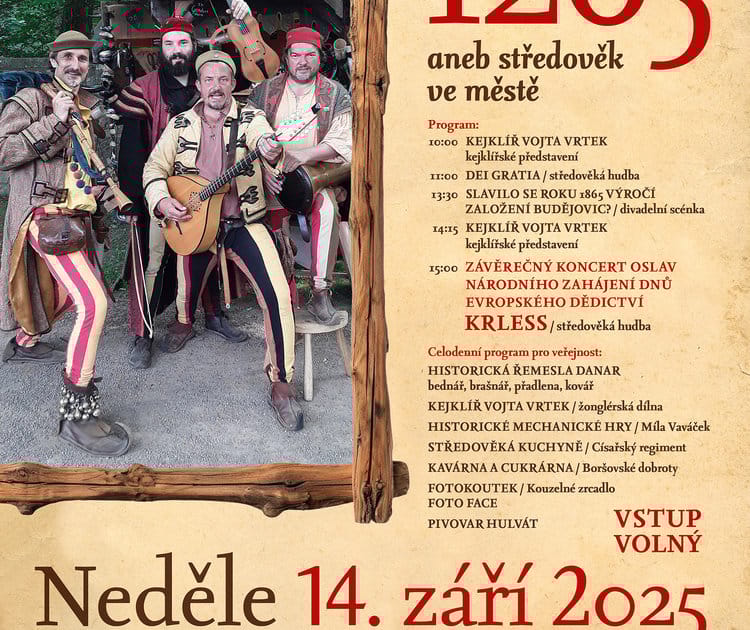 Vstupte s námi do atmosféry středověkého města – s hudbou, kejklíři, divadlem, řemeslníky i dobrotami z historické kuchyně. Celodenní program je určen pro rodiny s dětmi i všechny milovníky historie.