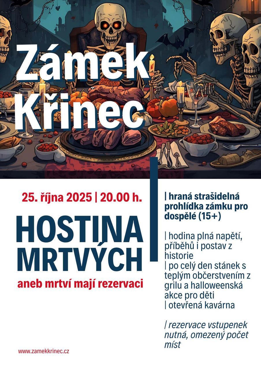 Úspěšná strašidelná prohlídka zámku Křinec je po roce opět zpět, tentokrát na téma HOSTINA MRTVÝCH ANEB MRTVÍ MAJÍ REZERVACI.