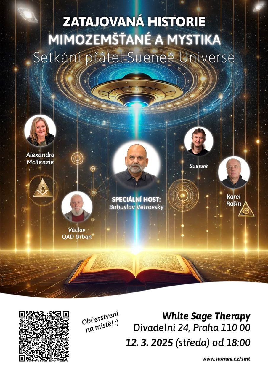 Zveme vás na setkání přátel a fanoušků zpravodajského serveru Sueneé Universe! Pojďme společně tvořit nový vesmír, setkat se u dobrého jídla v přátelské neformální atmosféře, sdílet zážitky ze setkání s ET. Téma: ZATAJOVANÁ HISTORIE: MIMOZEMŠŤANÉ A MYSTIKA