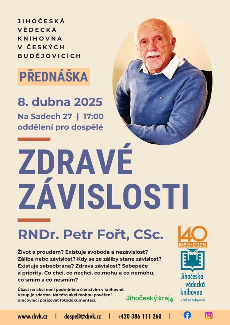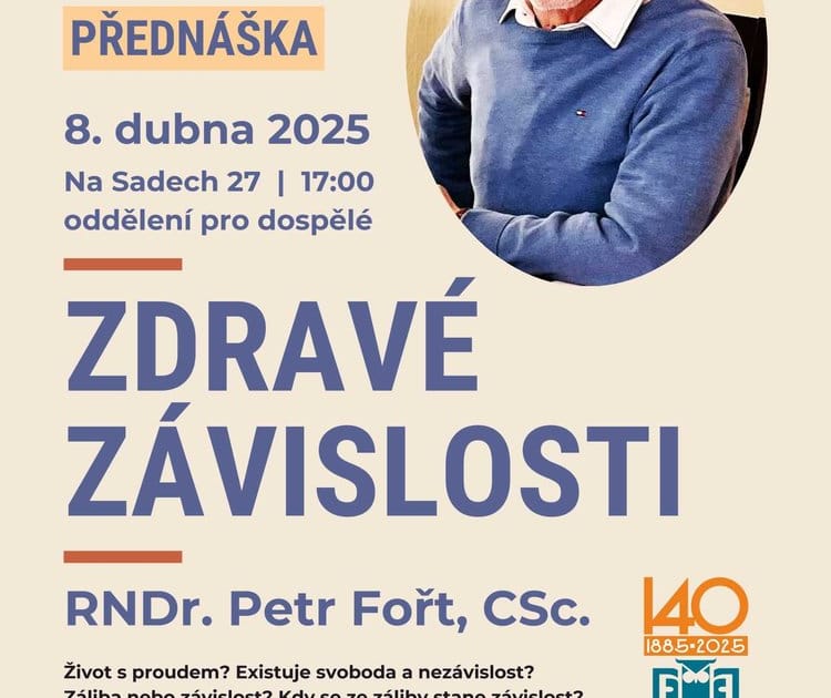 Život s proudem? Existuje svoboda a nezávislost? Záliba nebo závislost? Kdy se ze záliby stane závislost? Existuje sebeobrana? Zdravá závislost? Sebepéče a priority. Pokud bude dlouhé, tak poslední větu vypustit. Přednáška RNDr. Petra Fořta. Těšíme se na Vás v knihovně Na Sadech.