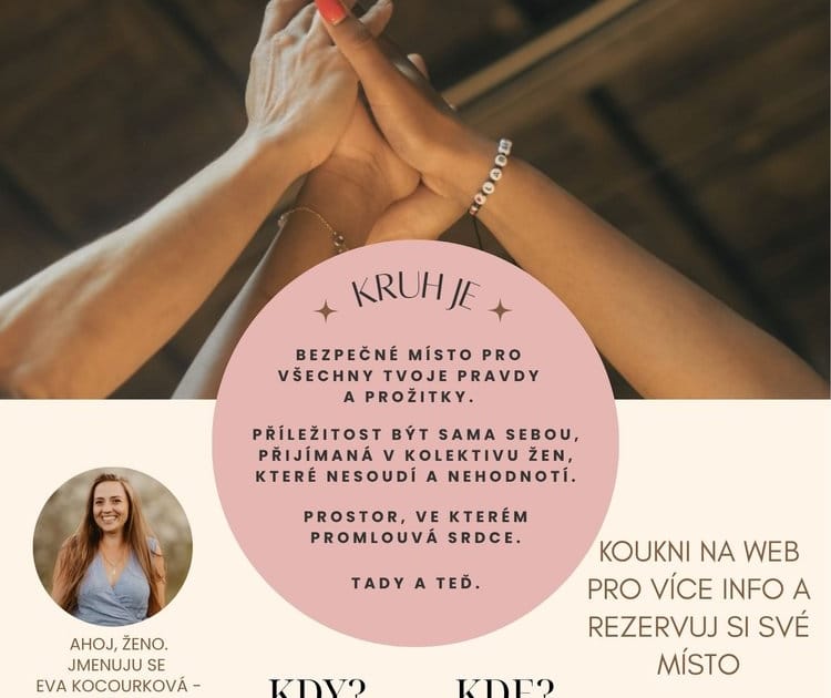 „Jsem EVA KOCOURKOVÁ – mentorka a průvodkyně na cestě rodičovstvím. Procházím ročním výcvikem transparentní kruhové komunikace, protože věřím, že ženy potřebují prostor, kde jsou slyšeny bez odsouzení a hodnocení. Sama jsem zažila, jaké to je cítit se odpojená… a sama – a právě proto dnes tvořím kruhy, které spojují. Srdečně Tě zvu, přijď se propojit“.