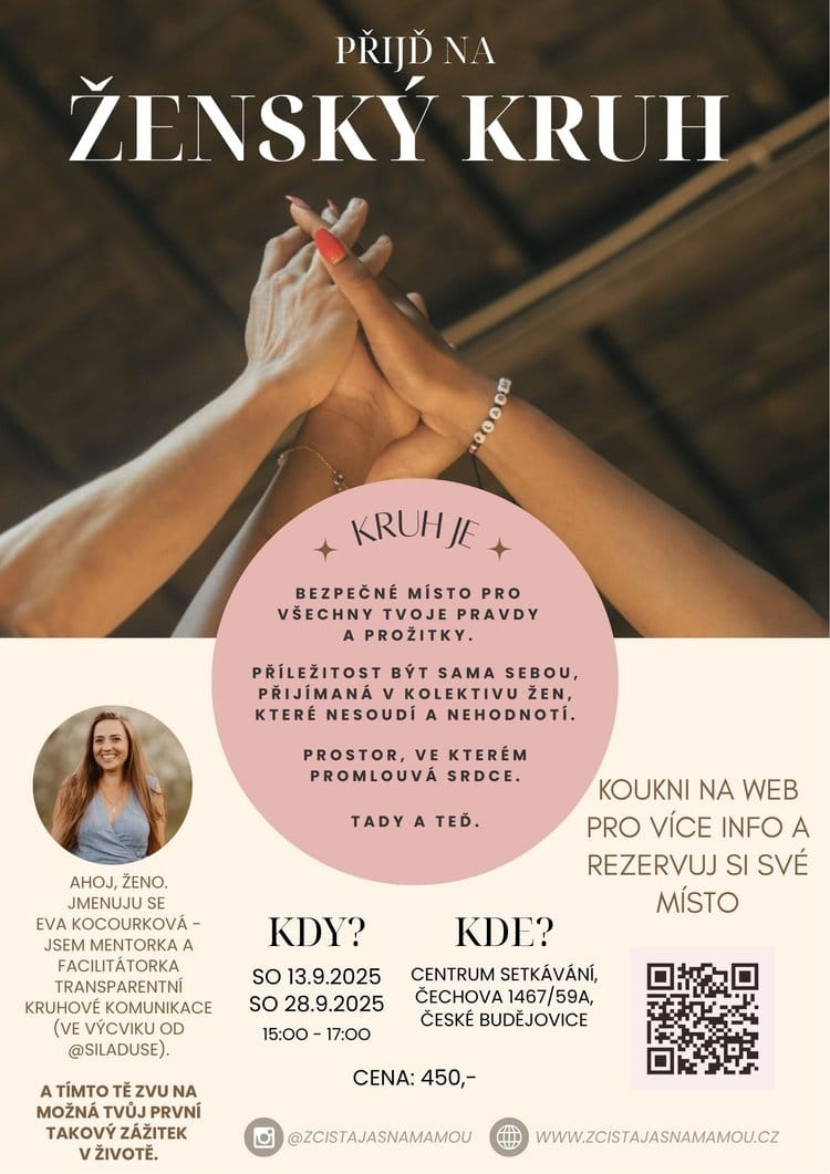Společně vytvoříme bezpečné místo, kde můžeš sdílet své radosti i bolesti a být přijatá přesně taková, jaká jsi. V tichu i ve slovech, ve smíchu i v slzách. Kruh je tu pro všechny ženy a je připraven jakémukoli sdílení (i ticho je sdílení).