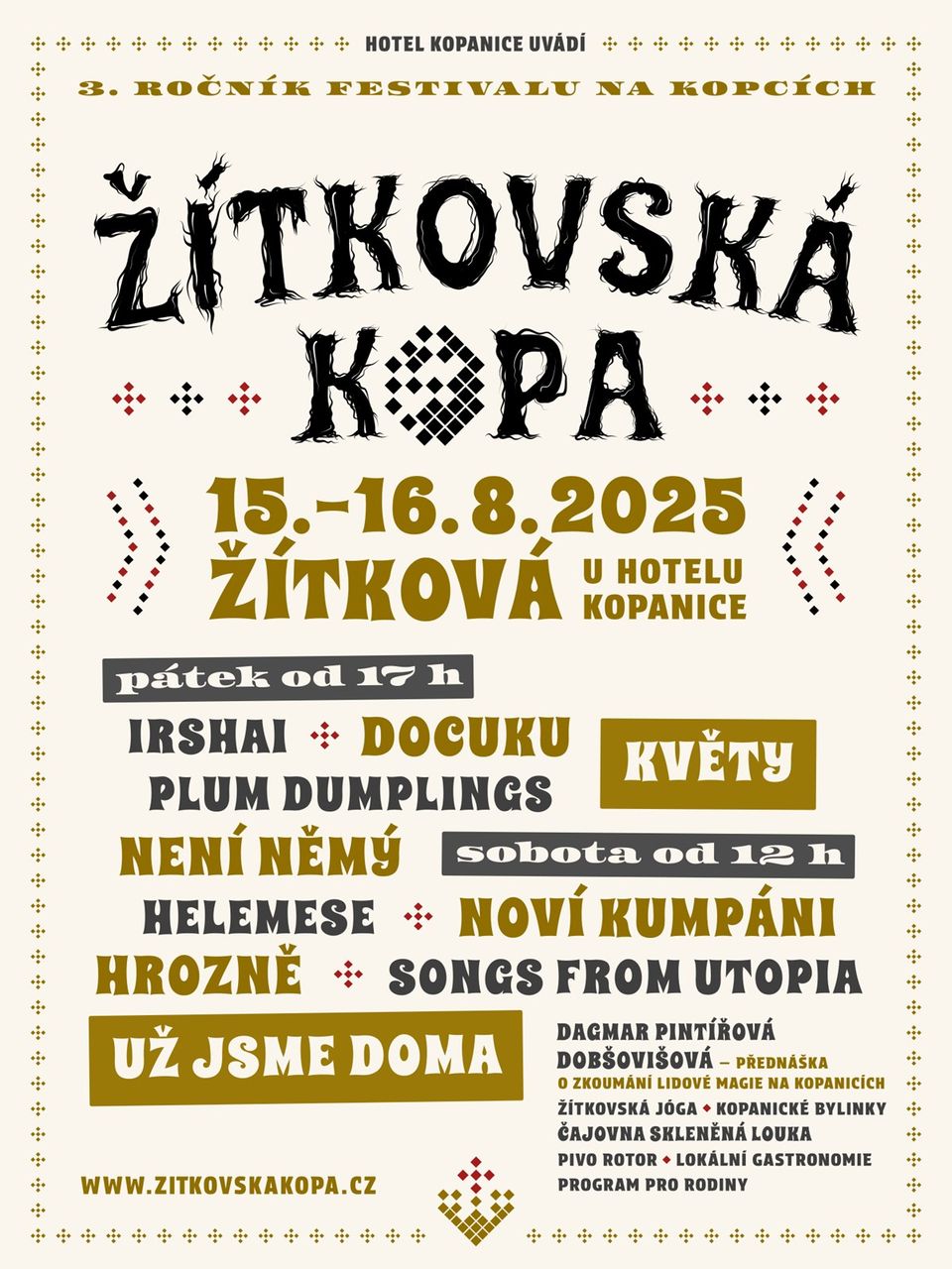 Přijeďte si užít víkend, který má všechno – muziku, tradici, jídlo, přírodu i lidi, co ví, jak se bavit. Už 15. a 16. srpna 2025 to opět roztočíme u Hotelu Kopanice v malebné Žítkové, přímo pod hvězdami a sluncem, které nad Kopanicemi svítí tak nějak víc do pohody.