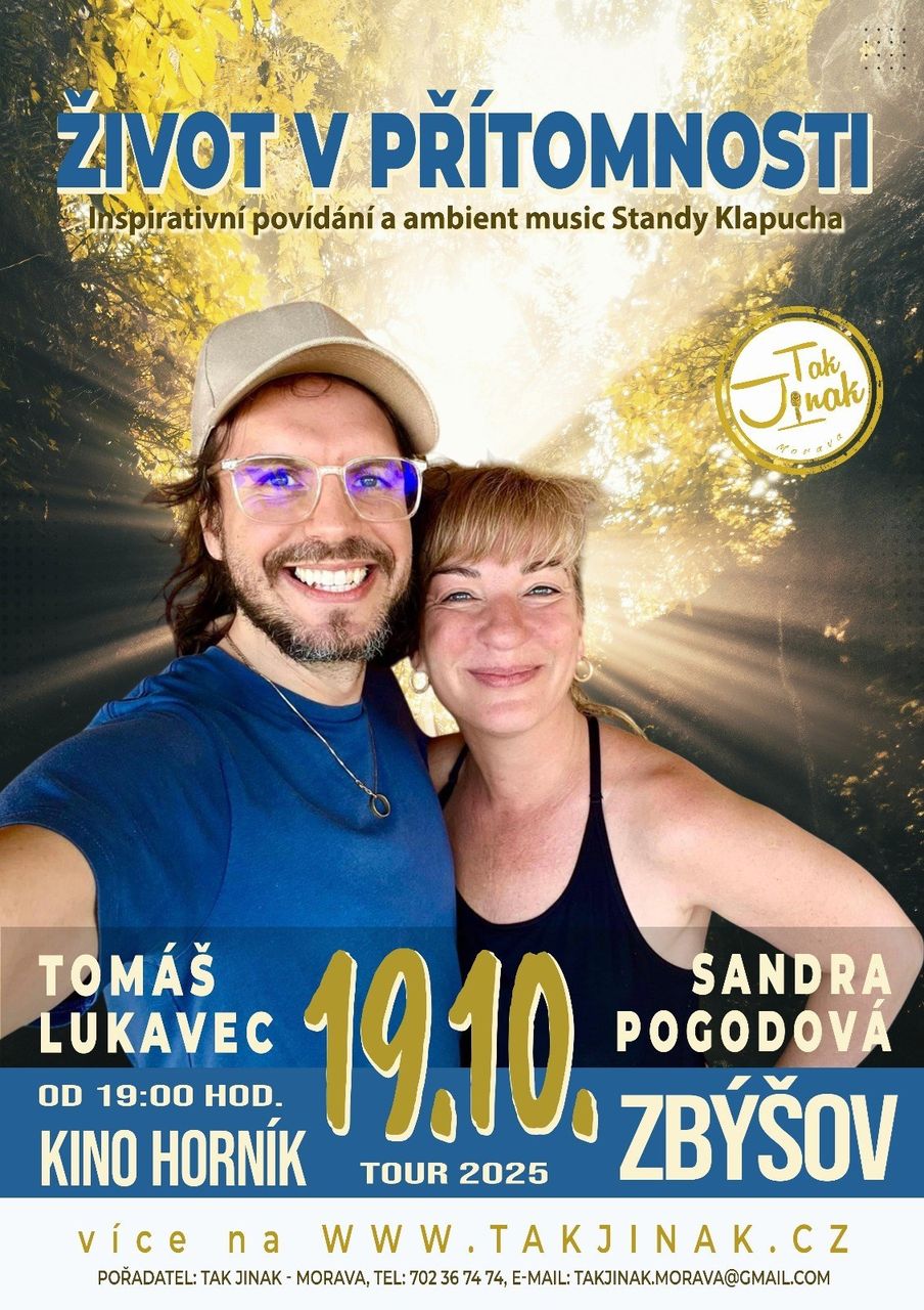 Těšit se můžete na inspirativní povídání Sandry Pogodové a Tomáše Lukavce. Dozvíte se o jejich zážitcích z cest a pobytů v Thajsku, Tibetu, na Srí Lance nebo v poušti. Sdílení a poučení z osobních příběhů ze života a vzájemné inspirování se na cestě k duchovním přeměnám. Hlavně vše s humorem a nadhledem, tak jak je těmto dvěma úžasňákům vlastní. Besedy hudebně doladí ostravský skladatel, muzikant – hudební astronaut STANDA KLAPUCH nebo partnerské zpívající duo Malí – Petr Malý a Paya.